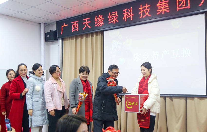 派红包送鸿运 炮竹声刚落,会议室里集团各部门员工与代理商各团队纷纷走上舞台,向名誉董事长李玉强先生和运营总裁郭阳女士拜年送祝福。两位领导面带微笑,亲切地接受着每一位员工和代理商的祝福,并为大家送上了承载着集团对大家深切关怀与美好祝愿的开工红包。在这一刻,大家深切地感受到了家的温暖与力量。 家乡特产互换 活动的重头戏——以抽奖的方式进行家乡特产的互换,将现场气氛推向了高潮。员工与代理商们纷纷上台,抽取数字,领取承载着不同地域家乡的记忆与情感的家乡特产。 在品尝与分享的过程中,大家不仅增进了彼此之间的了解与友谊,更深刻体会到了中华大地的广博与多元。这一刻,天缘绿科技集团的大家庭仿佛成了一个微缩的中国,每个人都在这里找到了归属感。