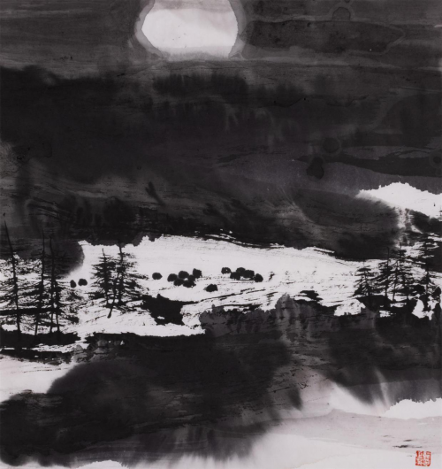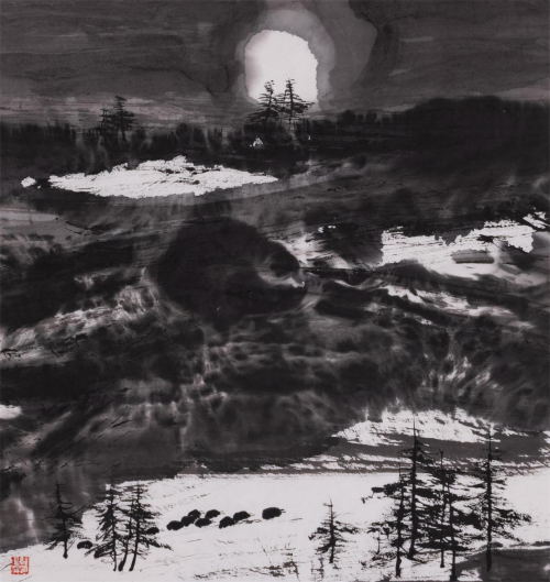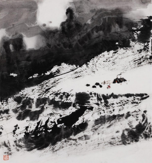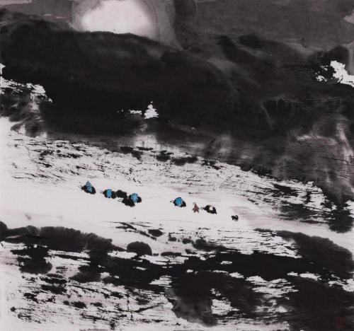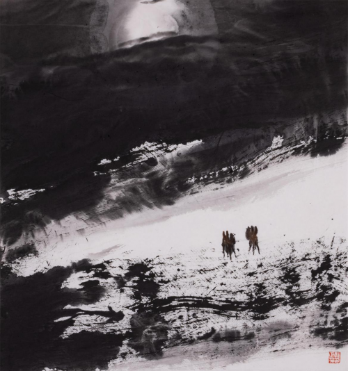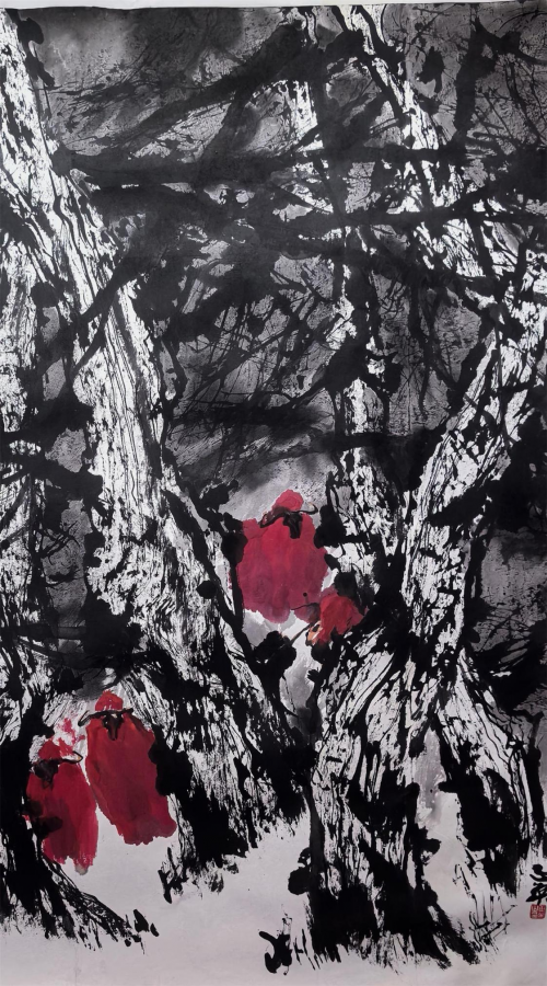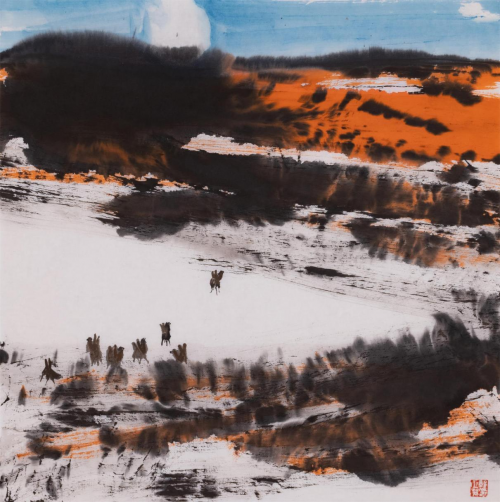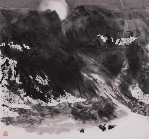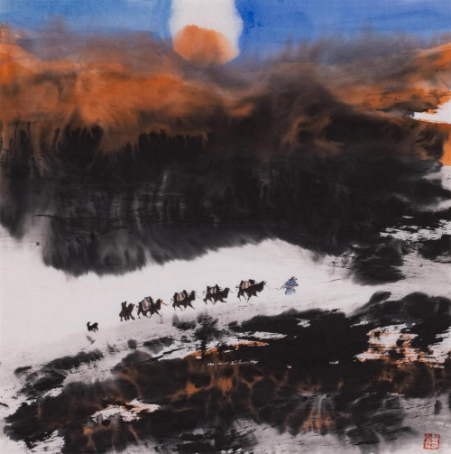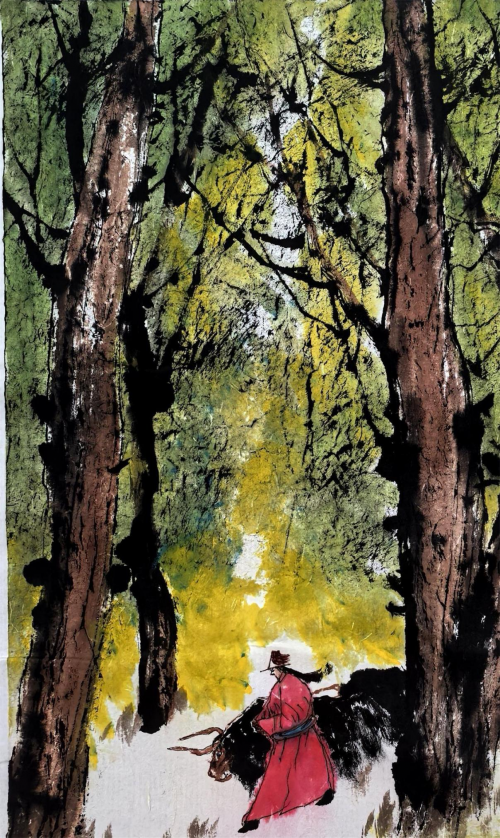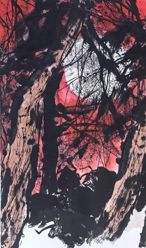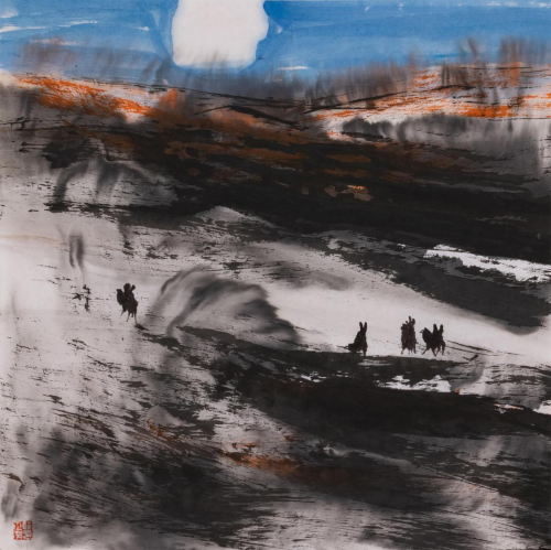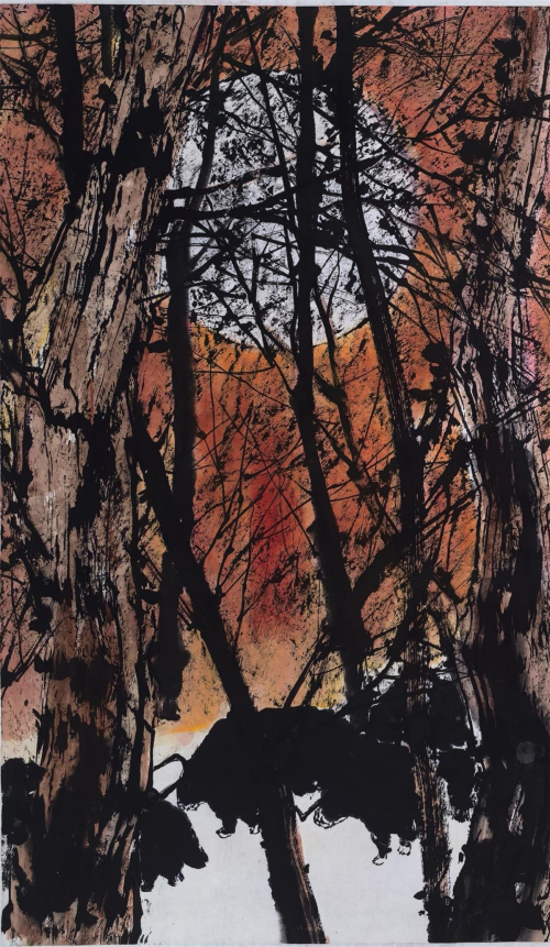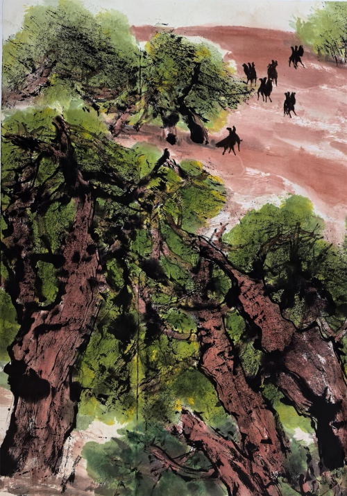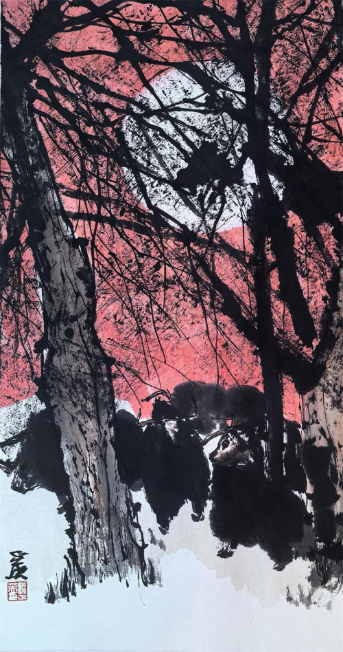 时下,郭正英先生的艺术成就已汇溪成海、积土成山,声名远播。他的山水画艺术,巳是一个介于“出世”、与“入世”之间的清明世界,是遥远的古老传说和西部戈壁沙漠的牧歌相融合的笔墨天地,是他内心对自然、对生活的种种怀想与感悟。早期,他曾潜心专注于西部山水与胡杨的创作,展示了他对于故乡祁连山脉神山圣湖和胡杨精神的深深挚爱。无论是春是夏或秋或冬,亦或是朝朝暮暮,朗月红日,大漠胡杨都能在他的心灵和作品中占有重要的一页。他长于删繁就简,统摄提炼,随性挥洒,精微收拾。在当今大写意山水画中自成一格。