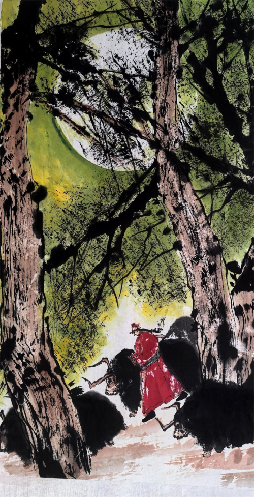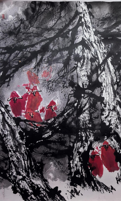 平时,他气定神闲,儒雅随和。而当他手握如椽画笔,挥毫向纸之时,便会凝神静气,吐纳天地,激情四射,神彩飞扬。如棋手布弈,下笔不以物象造型为先导,而以精神为引领,思接千载,意连八荒,聚天地于形内,措万物于笔端。寻觅不得不鸣之语,酝酿不得不发之情。积于胸,如水积坝,水高坝溃,便抓笔,饮墨,泼彩,走纸,逐物。故其画之情状跃然纸上。正是"情动于中而形于言,言之不足故嗟叹之,嗟叹之不足故咏歌之,咏歌之不足,不知手之舞之,足之蹈之也。真的是做到了凡画家动笔之前,进入一种虚静空灵的状态,唤醒此刻心中意象,主体意象远丰富于客观物象,笔下景物自然获得了 千姿百态,气象万千之情状矣!