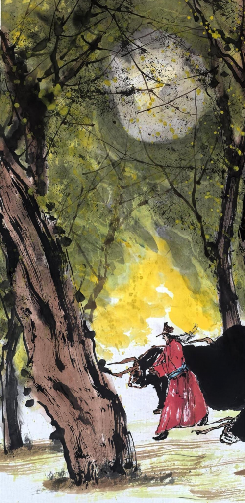 据传,在喜爱郭正英先生作品的爱好者中,曾有人窃窃揣摩,认为郭正英先生的画作能达到如此炉火纯青而又出乎意料的境界,定是得益于正英先生手中那枝如刺猬展箭丶如张飞扎须般的鼠须紫毫,以致郭正英先生的那支“马良之笔”竟不翼而飞,无处寻迹也去。