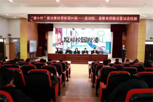 为进一步加强青少年法治教育,预防校园欺凌事件发生,2月19日,灌南县人民法院联合县教育局在长茂小学举办“守护青春 向校园欺凌说不”主题普法宣讲活动。灌南县法院党组成员、副院长马轶娟,县教育局党委委员韩贤及长茂小学校长汪红军等相关工作人员共同出席,与200余名师生一同开启了一场生动的“法治之旅”。
