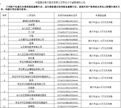 中国建设银行股份有限公司枣庄分行逾期催收公告