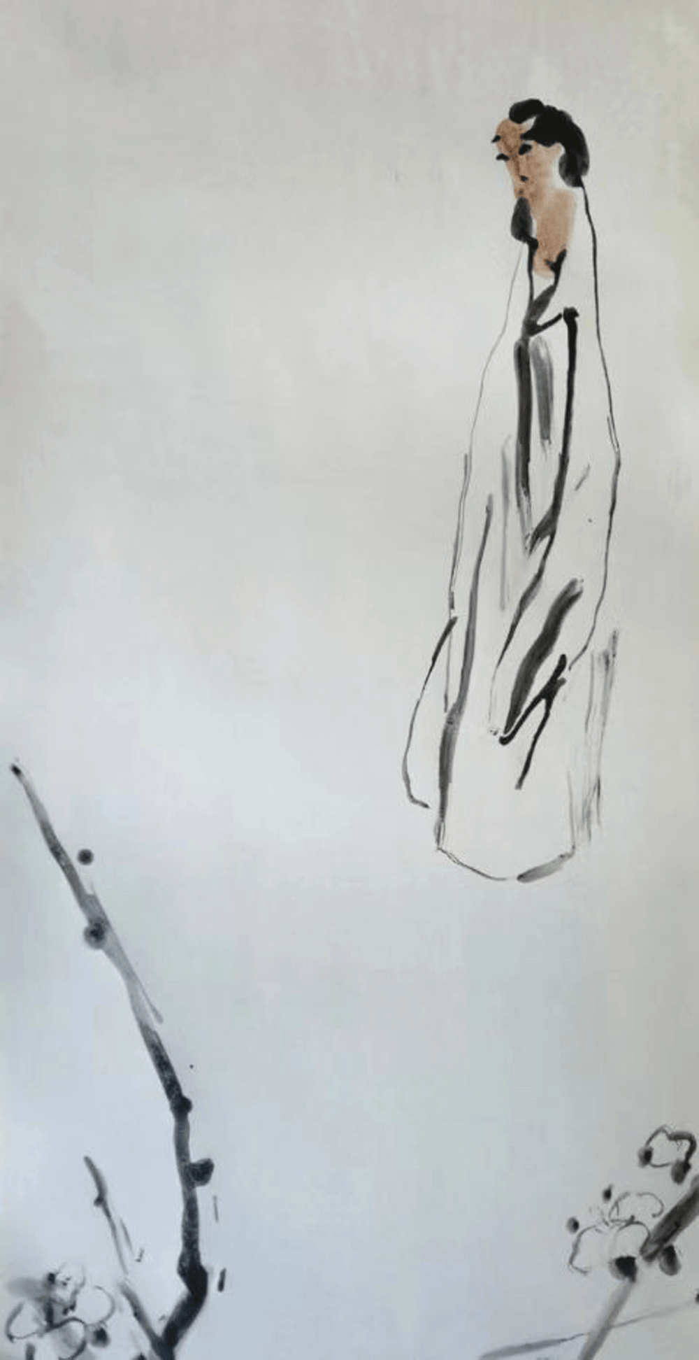 《清风》(指墨)50×45cm (三)意境营造与情感表达 赵英斌的写意人物画注重意境营造,通过画面的构图、笔墨、色彩等元素,传达出独特的情感与氛围。在作品《高原红云》中,以藏女为主体,通过对藏女服饰、神情的描绘,以及背景中高原景色的渲染,营造出一种神秘而又充满生机的意境,表达对高原生活的热爱与对藏族人民的赞美。他的作品常常蕴含着对生活的感悟与对人性的关怀,让观者在欣赏画作时能产生情感共鸣,感受到作品中蕴含的人文精神。