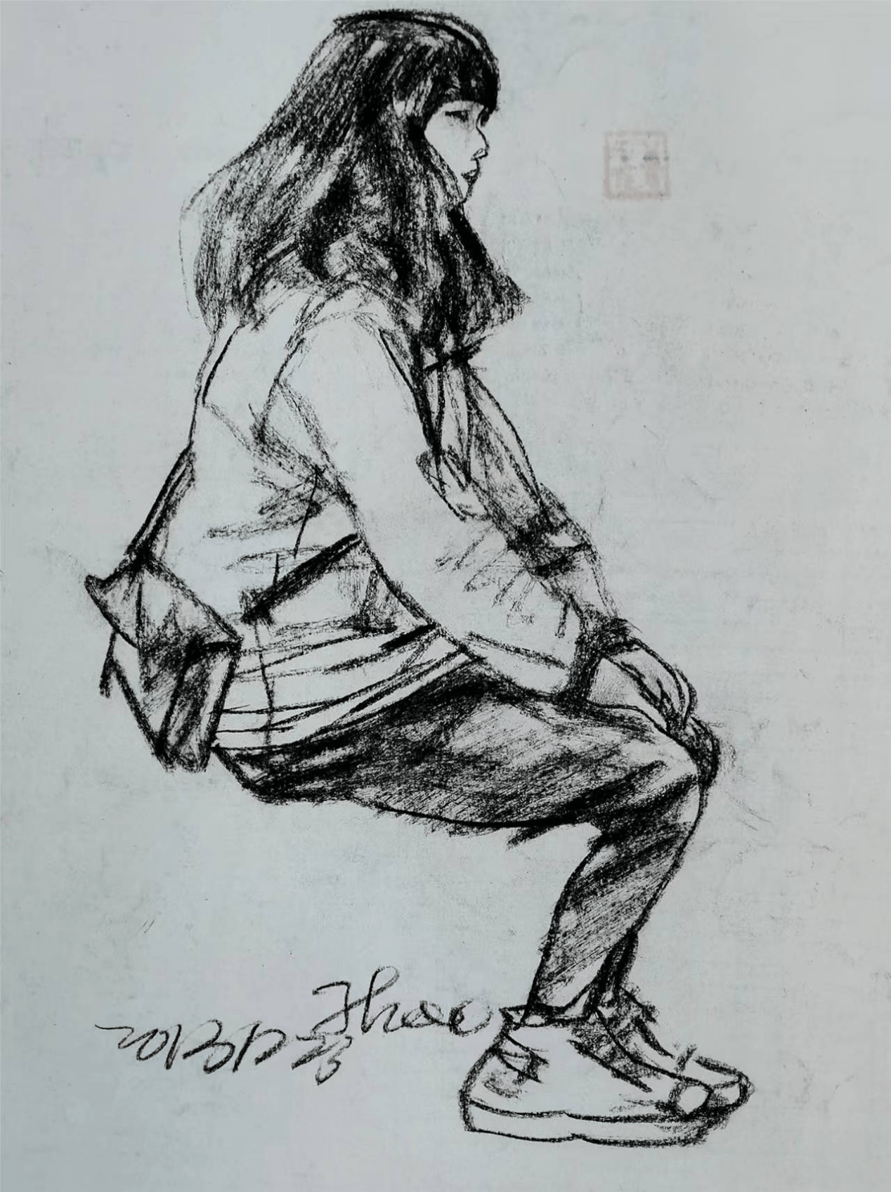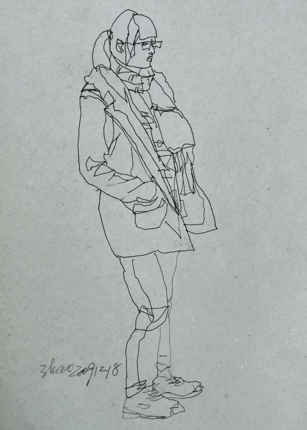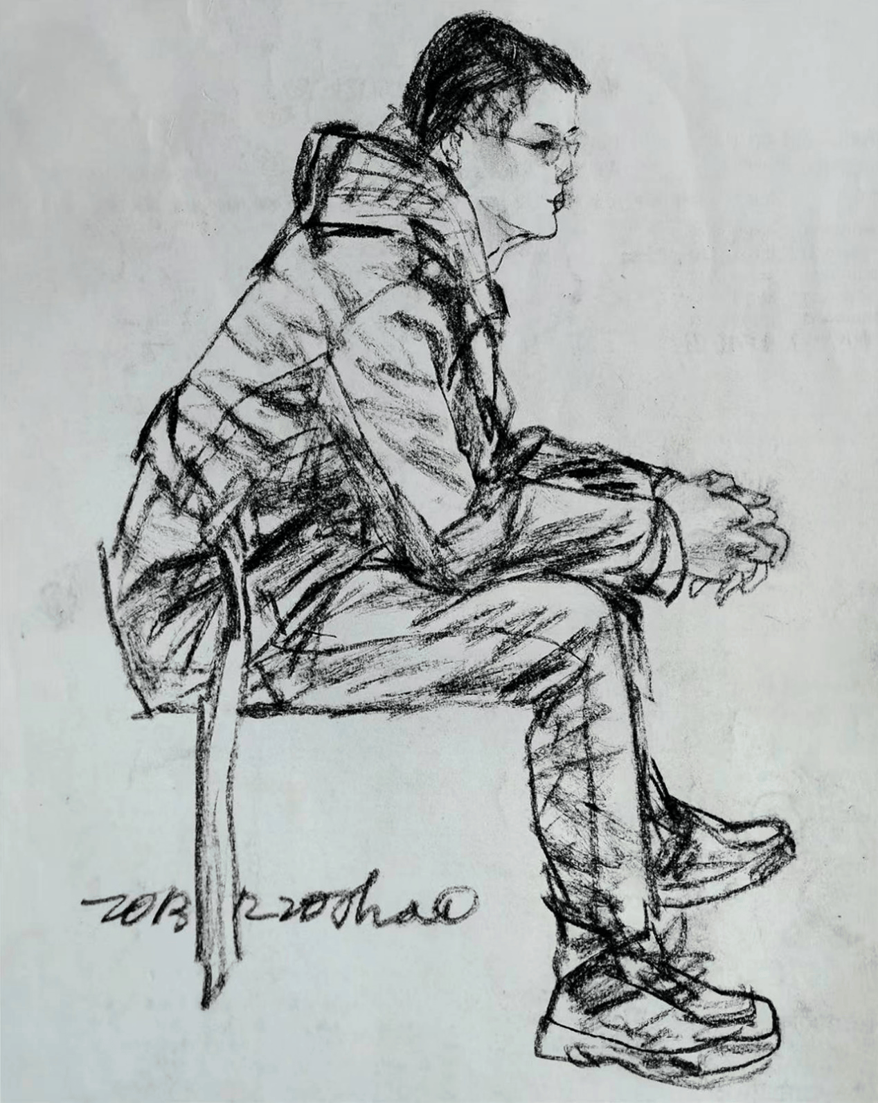 《雪原寒风》(指墨)135×70cm (二)对写意精神的独特理解 赵英斌认为写意人物画不仅是对人物外形的描绘,更是对人物精神气质与画家内心情感的表达。他追求“自然而然”的境界,在创作中摒弃表面雕琢,注重朴实自然,以简洁而富有表现力的笔墨传达深刻内涵。他强调“骨法用笔”,认为用笔应如孙过庭所说“翰不虚动,下必有由”,像齐白石“下笔直取,下刀直干”,潘天寿“不雕,强其骨”,通过有力的笔触塑造人物形象,展现人物的生命力与精神风貌。他注重画面的气韵与意境营造,力求通过笔墨的运用使作品达到“无形大象”的境界,让观者在欣赏画作时能感受到超越画面的深远意蕴。