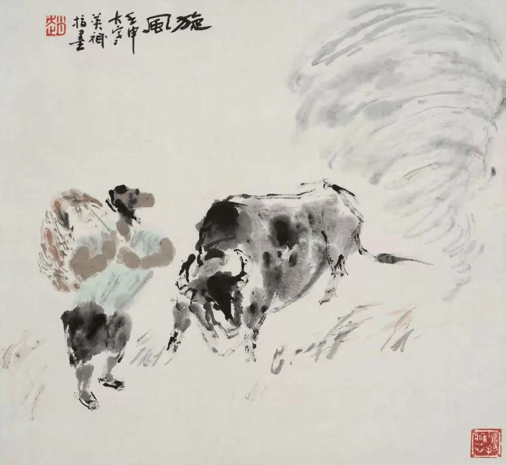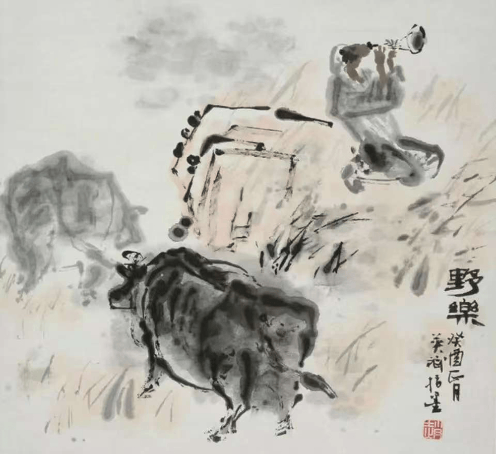 《野乐》(指墨)50×45cm 四、创作实践特色 (一)笔墨运用与创新 在笔墨运用上,赵英斌熟练掌握毛笔运笔用墨技巧,通过提按使转、抑扬顿挫,产生丰富的笔墨变化。他擅长运用中锋、侧锋、逆锋等不同笔法,结合墨色的干湿浓淡、焦渴润燥,塑造人物形象与表现画面质感。画人物肌肤时,用细腻的中锋线条勾勒轮廓,再以淡墨晕染表现肌肤的质感与光泽;画人物服饰时,根据服饰材质与动态,运用不同笔法,如用粗犷的侧锋表现厚重的棉衣,用灵动的中锋表现轻薄的纱衣。他还在指画创作上进行探索,以手指蘸墨或颜料,通过指肚、指尖、指甲等不同部位的运用,产生独特的笔墨效果。在指画人物画《旋风》中,用食指肚点厾表现人物黝黑的皮肤,用食指侧面画人物手指,头发用食指蘸浓墨趁湿破头部赭墨,产生焦枯蓬松的效果,展现出指画独特的艺术魅力。