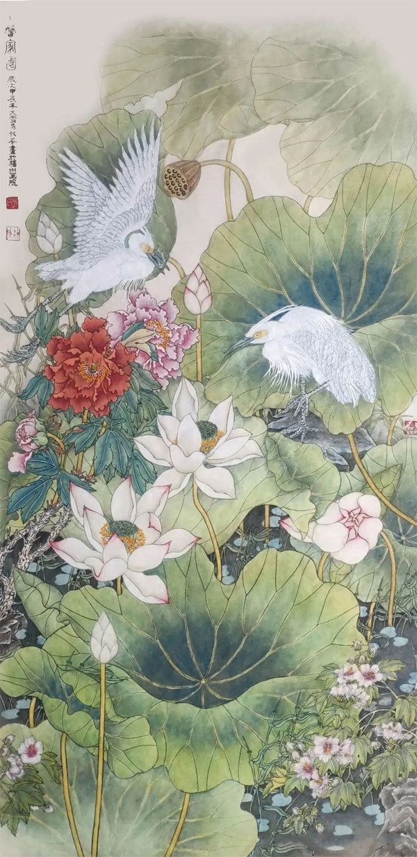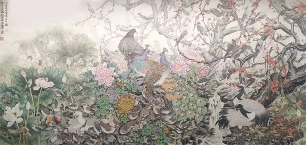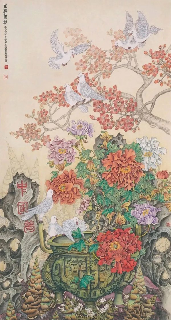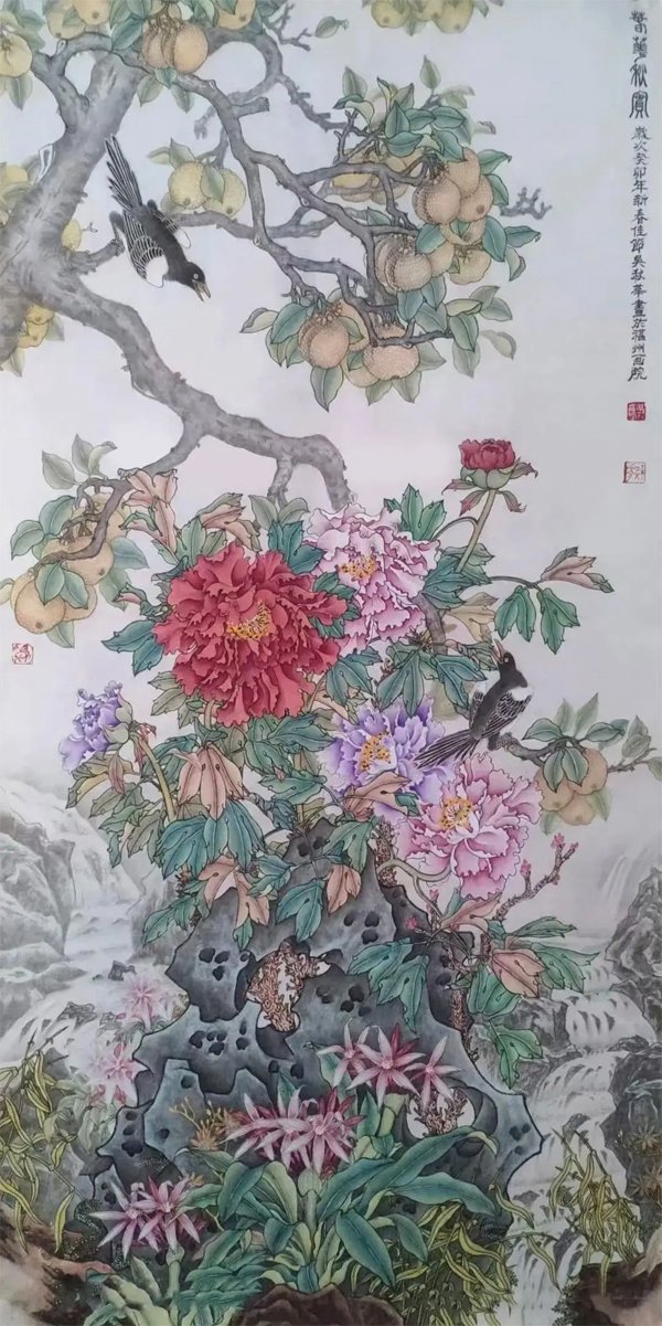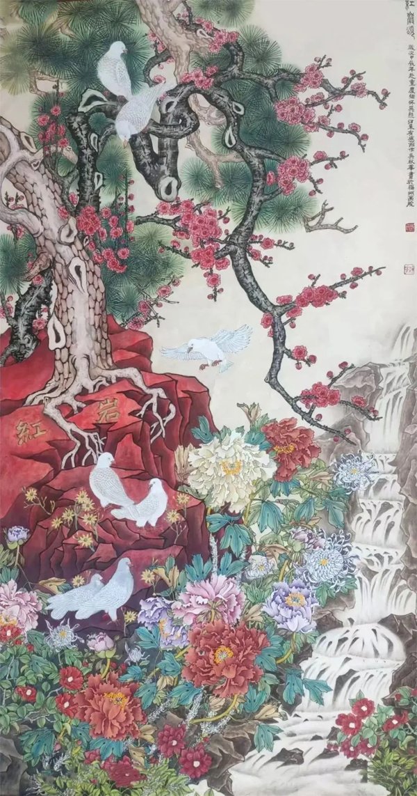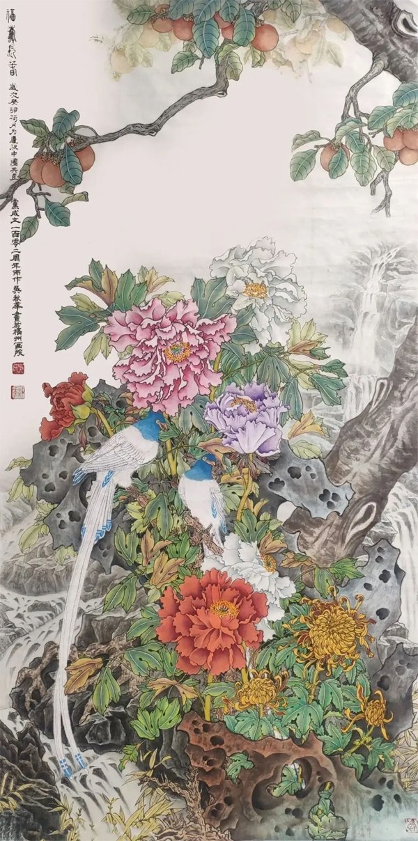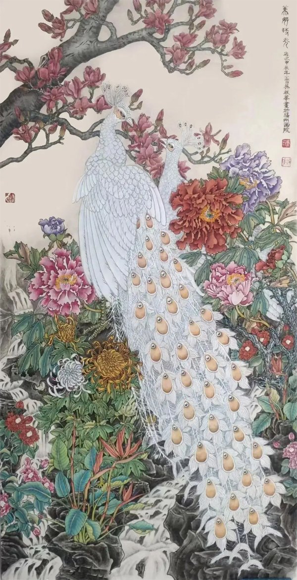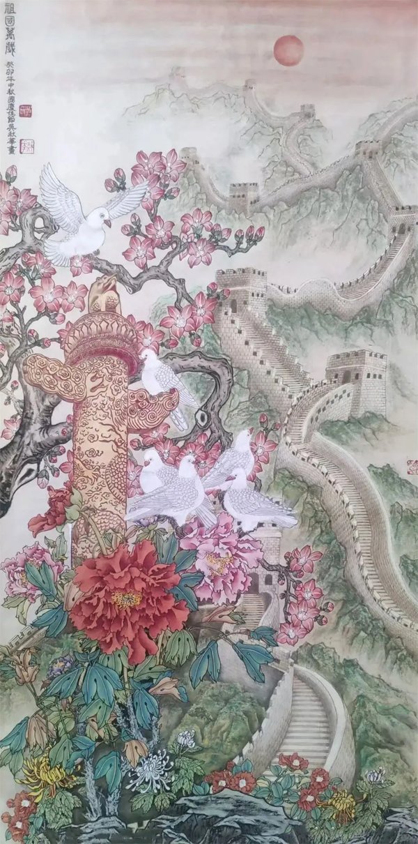 ![]() 《祖国万岁》138×66cm 2023年 个性是国画艺术的生命力 文/吴秋华 大千世界,不但动植物有个性,万物皆有个性,有个性才有生命力。艺术也一样。就中国画而言,它不仅具备造型基础、笔墨技巧这些基本功,还要在所画物象的神似上下工夫,因为中国画强调的是“神韵”追求的是“意境”,与西洋画强调的是“真”,追求的是“象”,是截然不同的两种艺术观点,所以中国画仅仅追求形似是不够的,还应该追求画面上的“神韵”和“意境”,通俗的说就是追求艺术的个性,何谓个性《现代汉语辞典》中告诉我们:个性就是在一定的社会条件和教育影响下形成的一个人的比较固定的特征。 ![]() 《神州盛开复兴花》136×68cm 2025年
