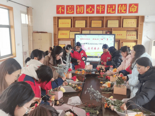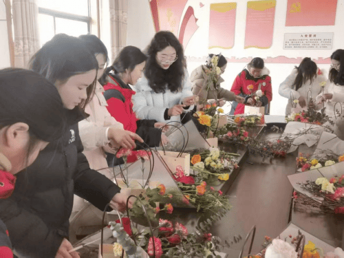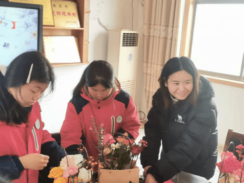 **以花传情,共筑师生心灵纽带** 活动现场,各色鲜花与绿植错落摆放,淡雅的百合、明艳的康乃馨、灵动的洋桔梗在师生手中被赋予新的生命力。女教师们化身“花艺导师”,与结对的留守女童、特殊家庭学生围坐一桌,从修剪枝叶到构思造型,手把手指导孩子们将零散花材变为独具匠心的花艺作品。一篮篮错落有致的插花背后,是轻声细语的鼓励,是默契协作的欢笑,更是心与心的悄然贴近。