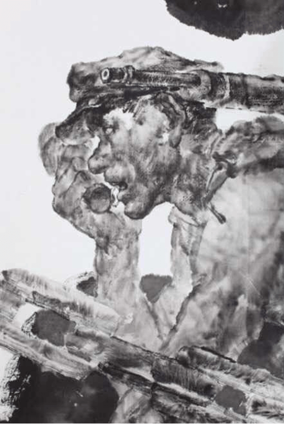 刘曦林:这里面渗透了你的个性,实际上你有很多地方也舍弃了,你把结构线面结合了,再塑造形体,凹凸感就加强了,力度也就加强了。你还解决了一个技术问题,就是墨会跑,那么你是如何定形的? 王阔海:这个很简单的,但是有时候想不到,那么想到了它就容易了,我就在墨跑的最好的时候,我要求定住它,不要再跑了,我突然想起了吹风机,一吹马上定住了,再进行下一层。