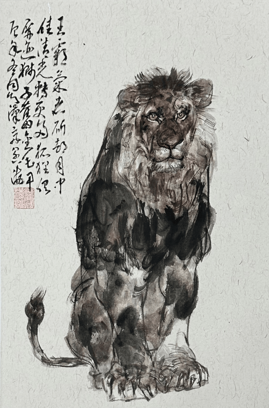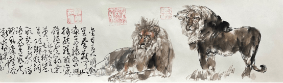 再一幅《王者之气》,狮子虽身卧而雄姿挺拔,筋骨强健,看上去气定神闲,画出了狮子不怒而威的王者风范。随着画面走势作草书题跋,或长或短,或大或小,错落有致,与狮子的姿势相得益彰,反映出王阔海先生随心所欲的画面把控能力,诗书画印浑然一体的文人画特质与韵致。同时也透露出,王阔海先生作为一位画家其坚定自信的“王者风范”,蕴含着作为一位艺术家对中华民族必然复兴的文化自信。而这种风范,是徐悲鸿一代大师在那种国破家亡的特殊年代所不具备的。 在中国古代,由于狮子是外来物种,画狮子是由画师或工匠以画谱口诀来完成的,在民间传说当中更多将狮子塑造为正义、吉祥、庇佑人间的灵兽,通过画谱为蓝本描绘出的狮子形象,只带有吉祥寓意的模糊形象。进入新时期,狮子被赋予新的象征符号,如果说在徐悲鸿等上一代画家笔下是带有悲壮色彩的写实形象,那么到了王阔先生这一代画家笔下则赋予和塑造为新时代中国崛起的真实写照,作为两代绘画大家,将动物走兽大写意都画成了一个时代的中国画典范。在新时期王阔海先生以新的画法,把徐悲鸿大师开辟的中西合璧之路向前推进到一个新的高度。