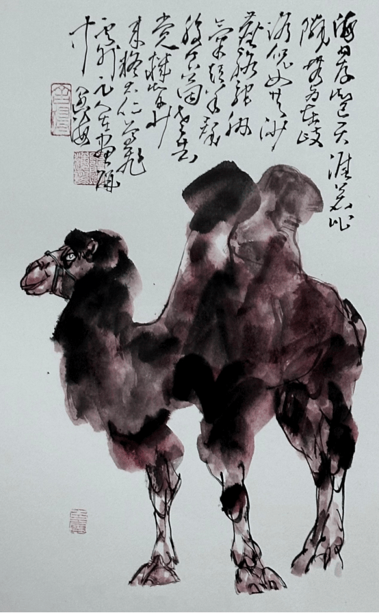刘曦林:他石涛的东西多一些。八大就是纯墨的东西,单纯的高雅。还有徐渭,你的墨气里面有徐渭的影响。你画的骆驼,你画的马,就有徐渭笔墨的一些精神,乱而不乱,笔墨层次非常微妙,黑白灰能分清黑中之黑,亮中之亮,灰中之灰,墨分十色是可以做到的。“哆来咪发索拉西”都有了。同时你掌握了冲墨,冲的过程当中如何有度,这个度你把握得非常之好!再加上你的诗文与书法提高了你所独创的新汉画的品味,可以说明清文人画的笔墨精神在你这里得到了延续,成为极少数的承薪接火之人。 王阔海:谢谢您的夸奖。我的新汉画,丰润华滋是容易做到的,但是那种大块的黑白灰干湿的强列挤压与对比,在冲墨冲色过程中肯定会被减淡,那种干裂秋风是有的但不会很强烈,这恰恰是中庸的审美境界。因为焦墨冲进以后,它干了以后只能降为八成。我画中最黑的是在阿睹之中,在于点睛之笔,那就是最黑的、最焦的就在这一点。泼墨如水和惜墨如金这两种画法,应该说我是惜墨如金。我把艺术形式比作一床小被子,盖着头露着脚,盖着脚露着头,总不能十全十美,关键是夸大其倾向性,吴昌硕厚重有余而明快不足,齐白石明快有余而厚重不足,他们一个是“积墨法”,一个是“一笔画”,画法不同效果不同,他的优点也是他的缺点,他的缺点也是他的优点,这个倾向性就是艺术风格。