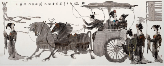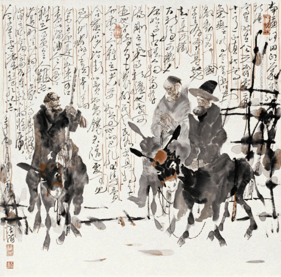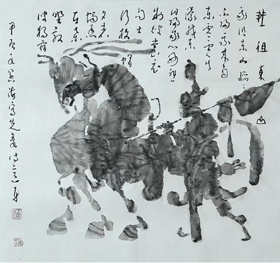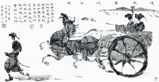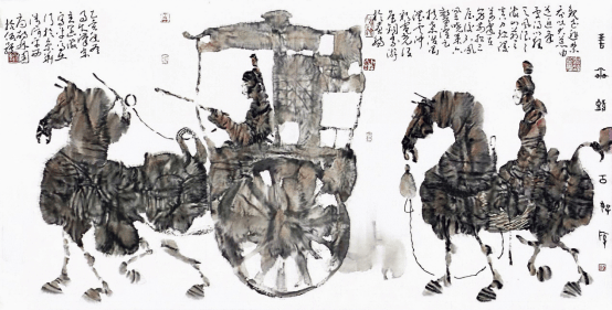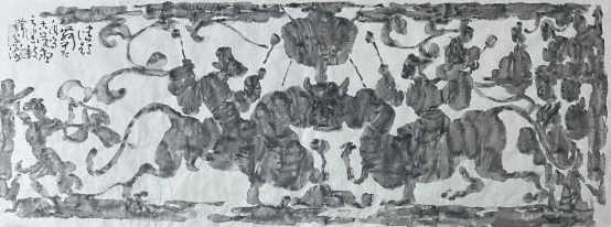 当时由大作家李存葆先生撰文,其词曰:“余钟情汉画像石刻久矣,尔来去嘉祥、南阳探迹揽胜,则为震古烁今之汉代艺术所痴迷,我沉眠于石刻碑林之间,嗟叹大雅久之不作,先人无论凿马刻人,铭兽镂神,皆铁画银钩,摅骋技巧委蛇有章。余汲取古汉画石刻艺术的精华,表现古将士鼓鸣旌飘,驱坚策肥的出征场面,旨在壮华夏之雄风”。他这段跋文写的太好了。 当时我画了一批包括《孔子施教》、《将相和》、《游春图》、《车马出行图》等等,最给我启发的是《骑射田猎》,当时也许是印刷模糊,给我感觉好像看到一种笔墨流动的感觉,我也把这幅画画下来,这是一个真实的汉画像石的原拓,我把它转换成现代笔墨了。这里面实行了大量的笔墨转换。