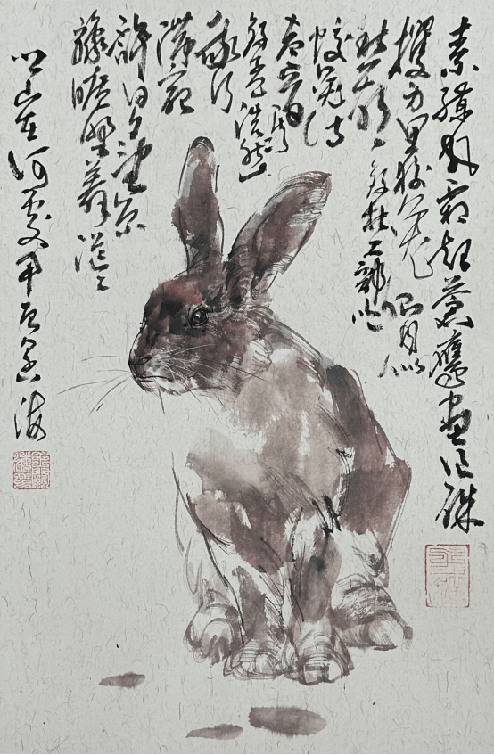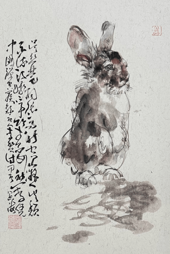 最后,我们看王阔海先生画骆驼。现当代有吴作人以画骆驼闻名,但他用的是西画的画法,以块面造型见长,虽用水墨但并非中国画的笔墨。其骆驼头部也太为概括,不免失于空洞。与吴作人先生相比,王阔海先生画骆驼,用“中国画素描”与以线造型融合的“王阔海六法论”,画出的是既写实又写意的大写意骆驼。特别是那两幅《任重道远》和《小憩》图,气势宏大,其造型极为结实而深入刻画,笔墨姿肆汪洋,水韵墨痕顺机生发,笔情墨趣自然滥觞,足以看出明清徐渭、八大之笔墨遗韵。无怪乎中国美术史论家刘曦林先生对王阔海先生赞曰、“承接了八大徐渭续接至今的文脉精神,成为极少数承薪接火之人。”再从王阔海自题的一首七绝的后两句诗“今时亦失文长墨,斯图似出雪个庐。”足可看出王阔海先生的文化与艺术的自信。 由于篇幅所限王阔海先生画其它动物比如羊、兔、狗等动物,以及更具体的作品比较也只能暂且割爱了。 庄子语云,技进乎道(庄子《养生主》:“道也,进乎技矣。”)。心中有道,有天道、人道、艺术之道,自然之道,才能绘出画之道,而最终归于老子“道法自然”之道。王阔海先生大写意动物走兽,可以说达到了神刀鬼斧,游刃有余,随心所欲不逾矩的自然大化之境界!至此也可以说近百年的“中西合璧”亦或是“中西融合”经过几代人的共同努力已经达到了“融合中西之长”亦或是“洋为中用”之“为我所用”的最完美阶段,而王阔海先生则是这最后阶段的炉火纯青之人。 癸卯盛夏于京都西山 褚哲轮(作者简介) 美术理论家、书法家。中国艺术研究院美术学(硕士)研究生。西南大学书法美学博士(在读)。中国海洋大学学士。中国国家画院教学文献编辑,中国国家画院书法篆刻院编辑,中国国家画院沈鹏工作室精英理论班(学术),中国书法绘画大型(教学)文献编委。历任《中外交流》月刊社编辑记者,《中国书画》报特约编辑,中国书画家联谊会秘书处主任,《中国凤凰美术》杂志执行总编,《凤凰美术报》执行主编,北京凤凰岭美术馆理论研究部主任等职。中国画院专职书法家。华夏文化促进会书画院特聘院士。2018年始任褚遂良书画院第一任院长、名誉院长。现任于中国文化艺术发展促进会书法篆刻院。