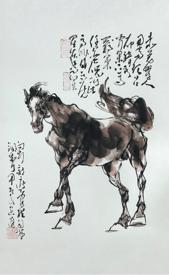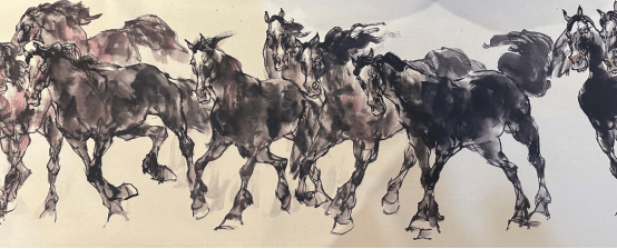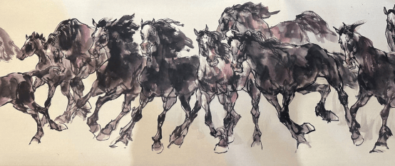比如王阔海先生创作的一幅《百马图》,是其中的代表经典之作。该作充分运用自创的“中国画素描”与中国画传统中的散点透视相结合的法则,创造出结构坚实立体感明显,而又左右延展,视觉广大,令观者随长卷放眼以观万马奔腾之势,给人一种气势浩荡,万马奔腾嘶鸣,一如冲出画面的强烈视觉动感!近而细观,则每匹马动态各异,体态健壮,骨感突出,体积方圆,肌肉隆起,线条劲利,一派铁画银钩老辣枯苍。大有宋代陈抟所言“开张天岸马,奇逸人中龙”之感概。在这里西方的素描油画诸因素悄然融化入中国画笔墨、水墨之语素而浑然天成;文人画的笔走龙蛇与线面结合的神出鬼没,笔墨的姿肆汪洋,流落洒脱,水渍墨痕的交融幻化韵味无穷,构成了一种墨的奇幻,韵的旋律、线的交响。使近百年的中西合璧进入化境。这对那些将中国画画成了油画和水粉画的所谓“中西合璧”者无疑是一种极好的榜样和警示。 徐悲鸿之后,则有韦江帆、刘勃舒继承徐悲鸿画马,把徐悲鸿画法中的某种因素放大,创造出更为大写意的画马之法,可以说用的是徐悲鸿画法中的减法,而王阔海先生用的则是除法和乘法,除去西画的光影,再乘以中国画的笔墨。 如果说悲鸿画马可以喻为“致广大”,那么王阔海的画法则既“致广大”又“尽精微”。王阔海先生在注重整体精神面貌的同时,在局部上进一步具体而微之,刻画骏马更丰富细致的表情、形态等动态形象,无论奔马、立马、跃马、群马,还是侧马、回马、背马,或神采英发,或遗世独立,骨力洞达,活泼灵动,生机勃勃,同时在笔墨运用上把大写意画马推到了前无古人的一个极致。