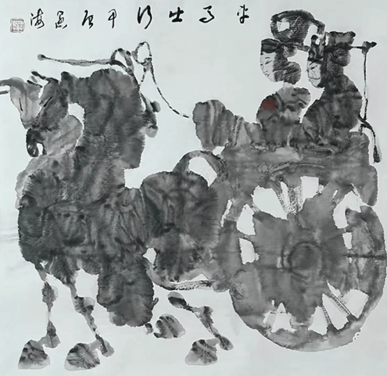 开始研究我的艺术触角,我到底要往哪个方向,此时我看到汉画像石刻非常震撼。再一个提到李存葆,他给我看了一个人家送给他的武梁祠的车马出行图,然后他裱起来让我看,对我触动也非常大,因为我过去看到的都是印刷品,那么看这个原拓给我触动很大,太现代了,这个马上还有马,人上还有人的平面构成,很浪漫,大汉民族的文化精神展现得一览无余,真是博大的、阳刚的、雄浑的、外放的、那种现代派的,使我眼睛一亮,如果说能把这个转换成现代水墨,把石刻形态转换成水墨形态,这个在中国美术史上是没有的,是前无古人的。我当时很激动,眼睛为之一亮。我还看了南阳的汉画像石刻的印刷品,有个骑射田猎图,也许是石头破损的模糊,也可能照相模糊,也可能印刷模糊,跟笔墨在那流动似的,恍惚间我看出一种笔墨的流韵,如果把这个转化成流动的现代水墨不得了。