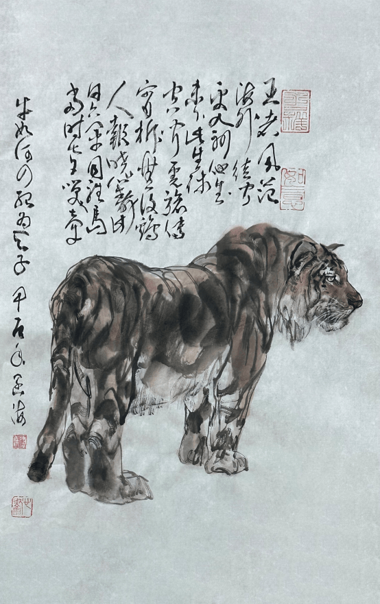 冯大中(1949~)画工笔虎,笔法如同丝绣发编,以破锋笔细丝而成,“丝毛”尽精刻微柔韧蓬松的毛绒不落笔痕,毛色的光泽感也表现出来,但又回到了传统的工笔画上。 虎为百兽之王,是强壮、威武、勇气和胆魄的象征,代表威严、权力和荣耀,是表示吉祥、平安的瑞兽,象征压倒一切、所向无敌的威力和胆气。俗语云,画虎画皮难画骨。不管怎么画,画出虎的外在形象不是唯一技能,能画出虎的威猛和气势,才是虎的魂魄和精神。而要表现这一点,中国画早就有标准,这便是六朝谢赫绘画“六法论”中的“骨法用笔”,也即后来所说的“书法用笔”。书法,是一切骨法的基础和基石,是大写意的骨和魂。我们发现,上面几位画虎大师,书法都不是他们的强项,写出的主要是画家字。还不如徐悲鸿,书法学康有为,颇具功力。仅仅从这一点,王阔海先生所画写意虎,就与他们从根本上区别开来。我们知道,王阔海先生的书法功夫深厚,笔力洞达,尤其是章草,如乱石铺街,大小错落,深得“道法自然”之高妙。无论是画正面虎、回头虎、卧虎、侧身虎还是山中虎,除了“王阔海新‘六法论’”中以“中国画素描”以线造型上的准确把握之外,笔墨的书写性,也是王阔海先生的最大特点和优势,由此而在内力上得其骨,在神态上得其威,在笔墨上得其韵致,与书法诗文和题跋印章,巧妙组合,构筑出一幅幅完整的虎虎有生气的画面。 再看画驴。黄胄以画驴着称。黄胄的绘画成就,得益于大量的速写,其主要成果体现在大量新疆少数民族人物速写稿。黄胄擅长人物画之外,还以画驴着称,在画坛被戏称为“驴贩子”。驴子在新疆随处可见,是黄胄笔下的常见形象,黄胄在新疆下乡时,画了大量的毛驴速写。黄胄被关进“牛棚”,放养了三年的驴。长时间与驴接触,使他与驴结下了不解情缘,所画的驴子或单个或群居,千姿百态,形态可掬。然而,与人物画一样,在其作品有意保留速写元素形成其独特的风格,也因速写元素的大量保留,给人一种书法用笔与写意性未能完成的感觉。其中一个重要原因是,黄胄的书法不过关,等后来意识到这个问题再补课的时候,因天不假年始终未能完成这一课,那么画的写意性自然就谈不上。不管什么画法,纯粹才是其显着而稳定的特质。与黄胄先生之相比,王阔海先生的大写意毛驴,用的是新“六法论”中“中国画素描”和传统骨法中的书法用笔,既不失其形态特征,又充满着浓郁的笔墨情调,尤其是《百驴图》长卷,与黄胄先生所画毛驴相比,其书写性与书卷气更加浓厚,达到了中国画写意的至高境界。 我们再看王阔海先生的大写意牛。绘画史上画牛,诸如著名的韩滉《五牛图》等,是经典的工笔画法,与写意牛尤其是王阔海先生的大写意牛,没有可比性,于此我们不论。能与之相比的,也只有现代李可染先生。李可染先生有着中西两种画法的基础背景,有必要先简单看一下其简历。