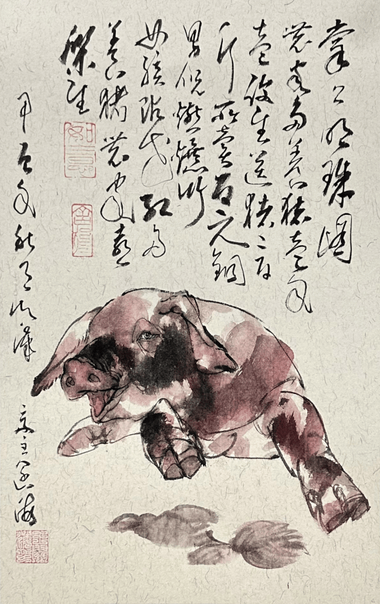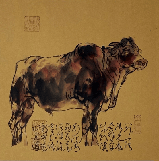 王阔海先生画牛,可以说是千姿百态,帧帧不失大写意之魂。或卧牛、行牛、耕牛、牧牛,或单牛、双牛、群牛,或老牛、小牛、母子牛,或食草牛、小憩牛、孺子牛,或凝目、回眸、俯首、哞鸣,或牛气冲天,或天牛卧看(题跋杜牧《秋夕》:“银烛秋光冷画屏,轻罗小扇扑流萤。天阶夜色凉如水,卧看牵牛织女星。”),皆刻画惟妙惟肖,多一笔嫌碎,少一笔不够,深得大写意精髓。既写实又写意,是王阔海先生既不与前人同,也不与现代李可染相同的自家画法,由此把中国画大写意画牛,推向一个更高的高度。 王阔海先生画过两幅《五牛图》,其中一幅画四头牛和一只小牛,一头俯首,一头昂首,两头目视前方,小牛依偎在母亲身边,形神兼备,意趣盎然。长题跋于左下方,参差错落,延伸至左边牛四蹄下,如一片草坪。其题跋曰: “冰冻雪寒牛背暧,夜沉风吼不思归。忽听娘亲声声唤,泪眼婆娑只有回。柳绿草青花正艳,哞哞奋起踏春来。郎骑牛背书声亮,遍地芳菲尽落台。步履蹒跚低俯首,犁痕作浪汗成畴。只为仓廪粮常有,戴月披星尽瘁酬。” 观之读之,另人感慨万千!右边一则题跋,与之遥相呼应,几方印章盖得特别讲究,富有趣味,增加了画面的丰富性与动感,境界美妙,充满诗情画意。这是一幅难得的诗书画印完美结合的精品力作手卷。 李可染先生曾在画作《五牛图》上题字曰:“牛也,力大无穷,俯首孺子而不逞强。终生劳瘁,事人而安不居功。纯良温驯,时亦强犟,稳步向前,足不踏空,形容无华,气宇轩昂,吾崇其性,爱其形,故屡屡不厌写之。”可染先生的肺腑之言,谁又能不说这也是王阔海先生追求艺术之路上的写照呢?