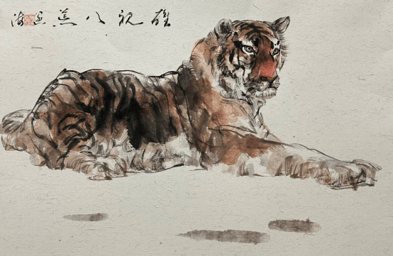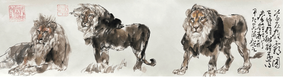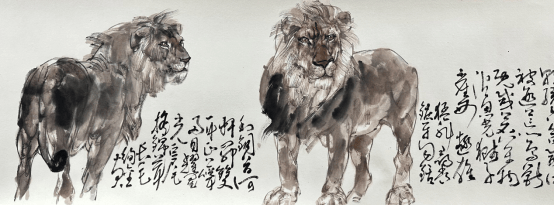 比如王阔海先生的《雄风图》图,画三头狮子,中间一头侧卧正视,目光坚凝,其狮子面部刻画更注重大型体与小形体的塑造,给人一种可触可摸,形象极其逼真,较之前人更为贴近对象!且笔墨轻松自若绝无死抠之嫌,可谓轻松而紧密,疏朗而厚重,可谓形神皆备,不怒而威,亦暗示睡醒后的中华民族这头雄狮力量的自信与坚毅。再看狮子的臀部与两后腿之间的结构刻画的让人称道,后蹄子是底部外翻其体积感与透视都是极难表现的难点,这却让王阔海先生画的自在轻松,微妙微俏,令人拍案叫绝!而狮子右边一头狮子鬃毛立起,“怒发冲冠”,目视左侧,四腿坚实,沉稳伫立,其线与面的神出鬼没,笔与墨的纵横交错,一派浑然天成。其狮子头微抬、嘴开张,作怒吼状可感“声威震天”的主题。左边一头侧身瞠目向右直瞪,与右边两头狮子成互应之势,蓄势待发,迥然有神,鬃毛随风飞扬,呈现出威风凛凛的气势。以赭石淡墨设色,用笔爽气明快,结构简洁精准,表达出一种果敢坚定的力量和昂扬向上的精神。
