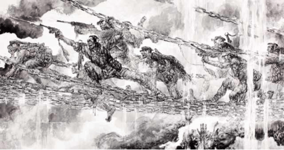 刘曦林:这就是你运用水的效果浓淡枯湿的变化。这几点抓住以后,你把原来在石头上的汉画像石把它活化了,把古汉画激活了。古代题材都是汉画像石的题材,那么到了当代这种新历史绘画的时期,你对汉画像石的营养怎么用进去?怎样和素描结合? 王阔海:我研究西方素描以后,我又研究中国画素描,就是为中国画笔墨服务的素描该怎么画?我在清华大学教学,第一个课就是中国画素描课。我提出了四要素,“以线为主,明确结构,线面结合,塑造形体”,这就是直奔形体结构的中国画素描,它讲究计白当黑的空白运用和丰富的笔墨色彩变化,而排除光影的一切干扰。