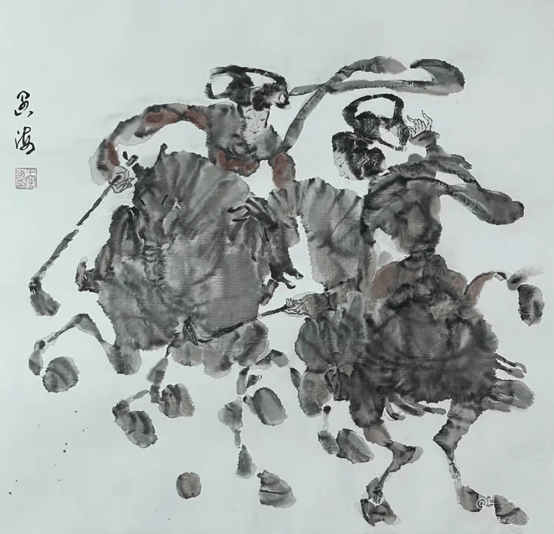 刘曦林:潘天寿讲:“不同才是艺术,不同就是独有、独到、独出机杼。你的新汉画肯定是独创,这是非常可贵的艺术品质。 王阔海:第二是总结新汉画的来龙去脉,起码有四个来源;1.学院派,我是解放军艺术学院国画系毕业,受到了严格的理论、造型、笔墨训练,为新汉画创新打下了坚实的基础;2.古典主义:古典指汲取汉代画像石刻,民间剪纸、皮影、唐三彩等姊妹艺术的精华,将汉画像的石刻形态转换成新汉画的水墨形态,将中国画的没骨画法开拓了一个新的领域;3.西方古典艺术与现代派构成。从西方素描、色彩到现代形式构成融化到了我的新汉画之中,关键是个“化”字而不是图求外表。对素描而言,我不仅研究西方素描,还研究为中国画笔墨服务的中国画素描该怎么画,提出了以线为主、明确结构、线面结合、塑造形体的中国画素描四要素,在清华大学高级研修班授课十年有余,走在了各大院校素描教学的前列。 依此理论与中国画笔墨相结合,就会明确线往哪里勾,墨往哪里落,很有可操作性,使我的学生受益匪浅。这些年来我的驴、马、牛、羊、老虎的写意画都是以此理论而画的,对前人有了突破性发展;4.文人画的品质。长期以来我始终坚持文人画诗、书、画、印四者并举的修行路线,来提高我的新汉画艺术品质、品位、品格。从南宋梁楷的《泼墨仙人图》,到八大山人、徐谓、张大千的泼墨没骨画法,来汲取营养。我的新汉画没骨画法既来自于传统、又有新的技法突破。若讲新汉画的创新我是自创一派,但对于恪守文人画的人文品质我又是保守一派。
