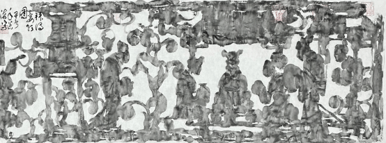 刘曦林:总起来有几种转换,一种是传承,黑白是传承。金石味道和毛笔之间并没有矛盾,中国研究金石学的艺术家们从书法里面得到了很多启发,从篆刻里面得到了很多启发,也从青铜器的纹样里面得到了很多启发。金石学始终伴随着笔墨学,始终伴随着它前进。但它们俩融合古人并没有很多的发现,你这里有了转换,这个转换非常好,一个是把拓片中的平墨、死墨转换成了活墨,把浓墨、干墨、焦墨转换成湿墨,把这个平面的造型转换成现在的造型,墨色的转换,结构的转换,题材的转换,材质的转换,再将书法也加进去了。汉画像石的书法很少啊,民间画工的作品比较多。一个是坚硬的冷冰冰的刻在石头上的画,而另一个是在宣纸上渗跑的现代构成的水墨画,你在这两者之间实现了巧妙而重大的转换,这真是难以想象。 王阔海:后来我把书法作为连接构图的一个主要方法和手段。