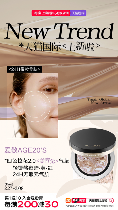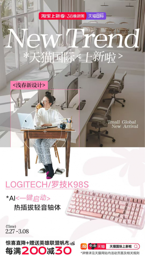 多巴胺、元气少女、格雷系、自然元素风等风格在初春时节大放异彩,“浅春新Look”承接春日衣橱、化妆台焕新趋势,为消费者提供春日style的多元化选择。韩国爱敬品牌推出的全新升级美容觉气垫,可24小时带妆修复熬夜暗沉肌肤,99%持久遮瑕,为消费者带来零瑕疵的春日新妆容。法国品牌Serge Lutens芦丹氏吊钟瓶肌肤游戏香水在天猫首发,温暖感的美食香调营造出怀旧气息,为春日look画龙点睛。3C用品的焕新也有春日之选,来自瑞士的Logitech/罗技品牌推出的K98S客制化机械键盘,半透明外壳,AI一键启动热插拔轻音轴体与一体缓震大中底,为电脑桌增加灵动春意。