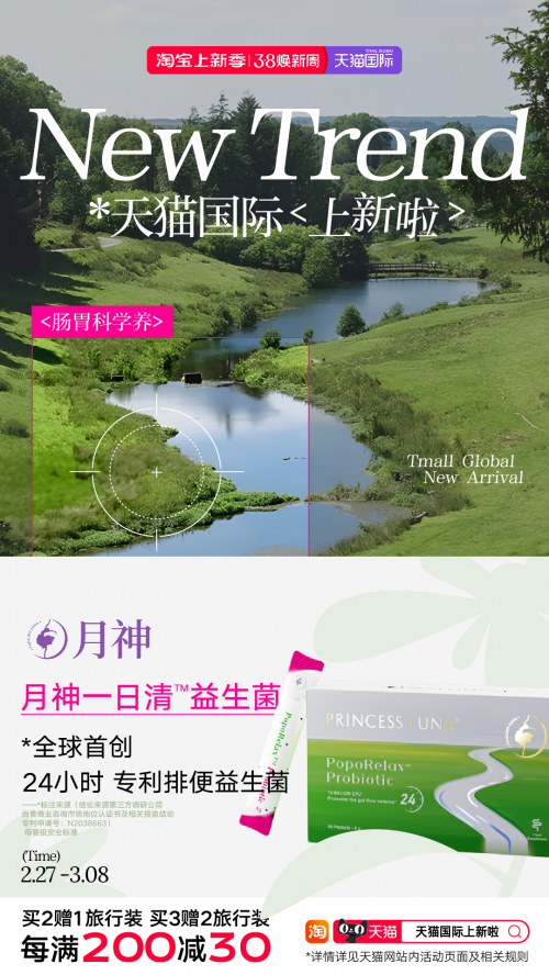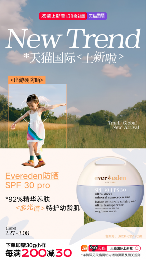 早春时节,万物焕新,正值消费者开春换季、采购新品的最佳时机,天猫国际的新品与新品牌营销也踏春开启。 天猫国际作为国内造新第一的电商平台, 是众多进口品牌入华的首选。此次38上新季天猫国际聚焦“出游硬防晒、春敏新肌愈、浅春新look、纤体新风尚、肠胃科学养”五大趋势热点,结合春日消费趋势,为消费者带来丰富的热销进口新品,满足消费者时令性的新消费需求 。 五大趋势应季上新 撬动春日消费心智 3月集合了春天应季上新、电商开年首促、38妇女节、开学季等多重强营销属性的消费要素,“38上新季”也成为了天猫国际联手各领域品牌方的“开春第一秀”。在天猫国际上,春季高热度消费趋势已经被解码为可以“复刻”的潮流。基于对春日消费情绪的深度洞察,天猫国际发布五大趋势热点,并携手各领域头部商家推出热销新品,撬动春日消费心智。 春天正是出游天,“出游硬防晒”装备必不可少。天猫国际预热发布“春装抢先购”流行趋势,汇聚各大服饰品牌当季新品,既满足了春日踏青的出片诉求,也能兼顾硬核防晒功能。在防晒霜方面,来自美国纽约的现代家庭皮肤护理品牌Evereden推出的婴童清润物理防晒乳,富含92%精华养肤成分,多光谱特护幼龄肌。