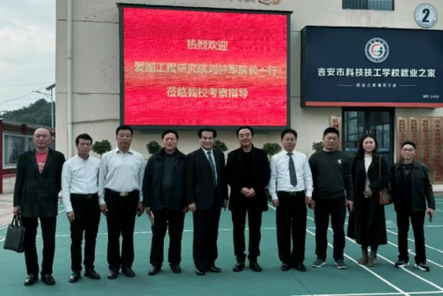 考察团一行在江西吉安科技技工学校,与吴坚校长等领导就“两法”宣教及“新时代国防爱国主义教育基地规建与学校融合发展”座谈交流。
