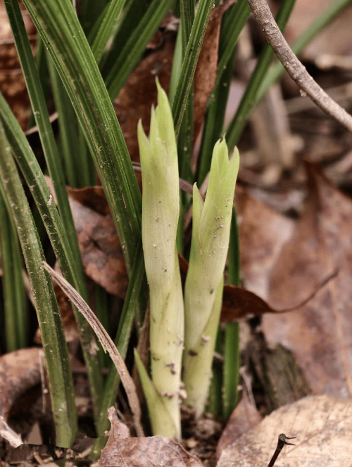 不时有游客下山、上山,边观赏边拿出手机拍兰花。站在山顶,迎着春风,发现这座4亩左右的山上自然生长着一株株高大的板栗树、苦梀树、枫树等落叶树木,还是初春,树枝都还未长出新绿,大部分树枝还是光秃秃的,树底下落着一层层厚厚的枯叶。