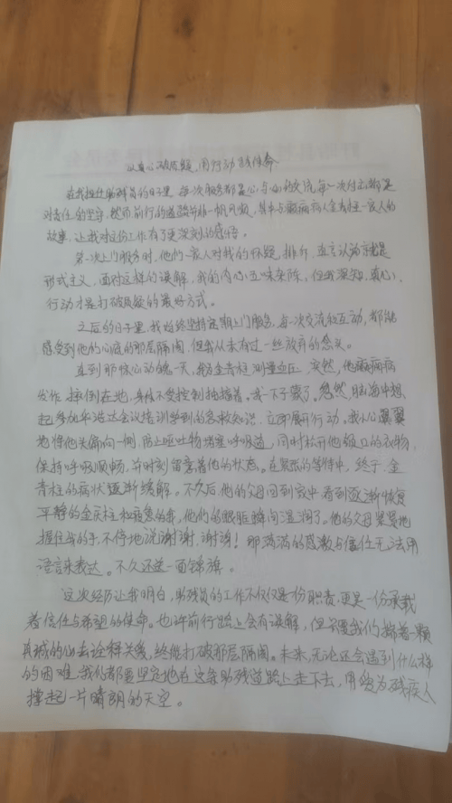 在我担任助残员的日子里,每次服务都是心与心的交流,每一次付出都是对责任的坚守。然而,前行的道路并非一帆风顺,其中与重病残疾人金青柱一家人的故事,让我对这份工作有了更深刻的感悟。 第一次上门服务时,他们一家人对我的怀疑、排外。直言认为就是形式主义,面对这样的误解,我的内心五味杂陈。但我深知,真心、行动才是打破质疑的最好方式。 之后的日子里,我始终坚持定期上门服务,每一次交流和互动,都能感受到他们心底的那层隔阂,但我从未有过一丝放弃的念头。