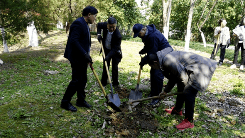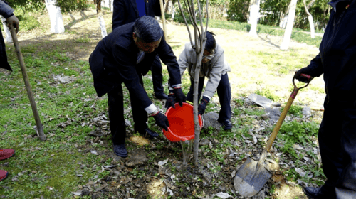 在植树现场,党员同志们,大家共同挥锹培土、浇水润根,并在栽种的树上挂起“红心育希望.携手筑绿梦”的牌子,以示将党建共建融入到社区居民生活的优美环境中,栽下的一棵棵柿子树象征着守护绿色生态的卫士。
