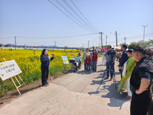 非遗传承人们将党的创新理论与非遗展演相融合,通过“小角度”阐释“大道理”,以“身边事”讲实“硬道理”,使理论宣讲既有温度又有深度,让游客听得进、听得懂、记得住。 活动现场,宣讲员叶信娣以针为笔、以线为墨,将乡村振兴的壮美图景绣入方寸之间。“这金黄的油菜花针法,就像我们乡村振兴的锦绣画卷;这一针一线,勾勒的是共同富裕的美好愿景。”她一边宣讲,一边飞针走线,转眼间朵朵油菜花跃然荷包之上。游客们兴致盎然地学习“打籽绣”等传统技法,在穿针引线间感悟刺绣的魅力、生态宜居的深刻内涵。这种寓教于艺的宣讲方式,既传承了非遗文化,又让党的政策深入人心,实现了文化传承与理论宣讲的有机融合。 随着市级非遗项目小花船轻盈穿梭在花海中,宣讲员魏金苗带领着船队缓缓驶来,“我们的摇船步要稳中带俏,船头起伏要如浪中行舟,一步一步走出的是传统文化的韵味。”他以船为媒、以舞为介,将小花船的历史渊源、艺术特色娓娓道来,引得游客纷纷驻足,纷纷模仿舞步,并在其中感受非遗魅力。