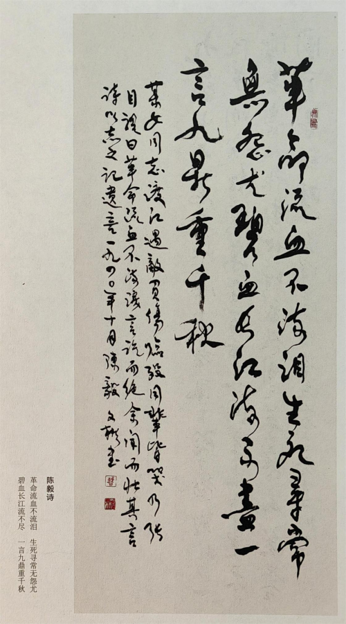 陈 毅《寄 遗 言》 革命流血不流泪,生死寻常无怨尤。碧血长江流不尽,一言九鼎重千秋。 某女同志渡江遇敌负伤,临殁,同辈皆苦。乃张目视曰:“革命流血不流泪”,言讫而绝。余闻而壮其言,诗以志之。一九四O年十月