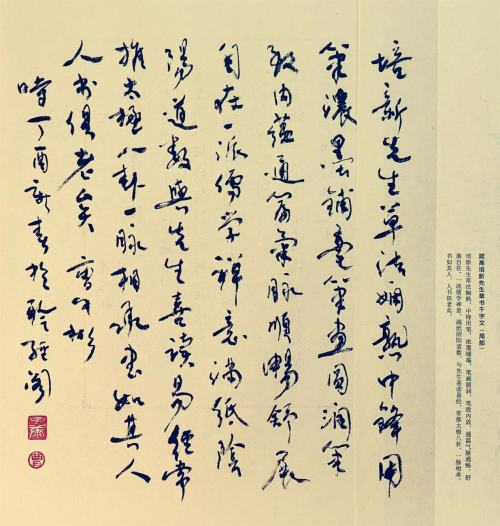 虞孝龙先生《 曹文彬章韵行草书 》序言择錄 最近看到曹文彬先生拟将出版的《章韵行草书》,真为他对书法艺术不懈追求的“古稀变法”,所取得的成果而高兴。 文彬少小临帖,中年习草,旁及隶篆,以草见长。他在研创草书20多年后,又于2002年开始了“追根溯源探章草”的旅程。他从现代章草大家王遽常先生的《千字文》入手,再学明人宋克,最后直追章草源头的史游 、皇象与索靖。十几年的努力,功夫不负有心人,现今他的章草,重气势、求灵动,用笔圆转如篆,点捺如隶,深沉古朴,典雅隽逸,不仅能登堂入室,而且在我省的章草名家中已占有一席之地。 为了让读者能对书法作品的文字内容多一些了解,他把章草的笔势和意韵,溶入到行草书中去。目前虽然还在不断的探索中,但已有不少个性鲜明的曹文彬章韵行草书作品问世。 曹文彬先生敬业诚信,豁达大度。他秉承“榕城十老”活到老学到老,老有所乐,老有所为的传统,不停的探索欲望,不止的追求精神,以及他“学百家出我家”,不随流俗,信步书林的初衷与成果,都值得一品。 二0一九年十月