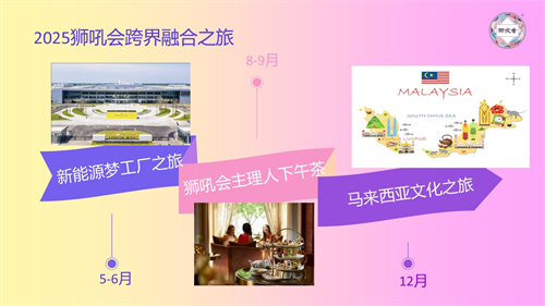从5月开始,将开展狮吼会跨界融合之旅,如新能源梦工厂之旅、狮吼会主理人下午茶、马来西亚文化之旅等系列活动。