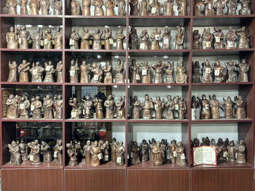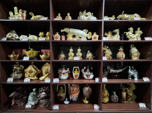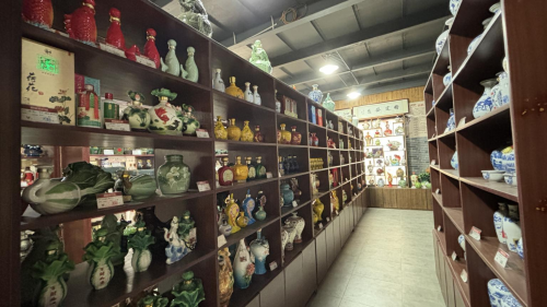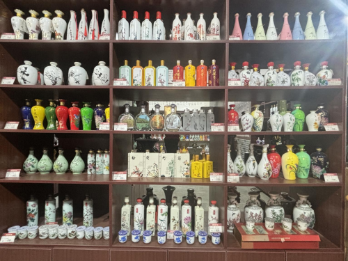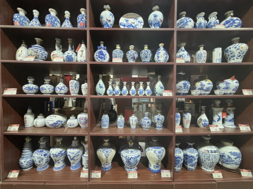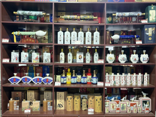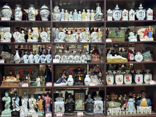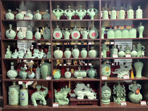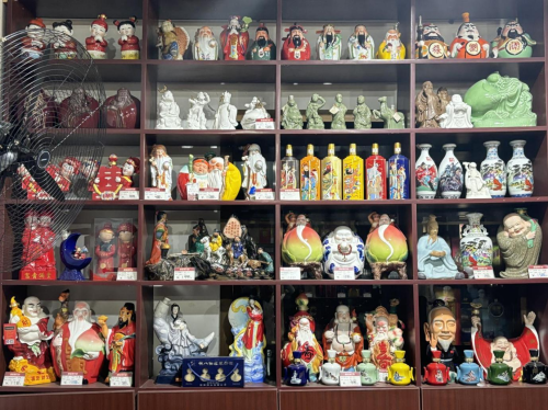 以三国刘关张、诸葛亮、曹操、杜康、刘伶、施耐庵、李白、四大美女、水浒108将、毛主席、鲁迅、江姐、雷锋、焦裕禄历史真实人物为主体而进行外观设计载具的各类饮用酒,此类饮用酒载具外观往往造型相对古典庄重,又因人物展示的需求,用色上大多不吝渲染。 逍遥山庄酒馆·青瓷区域