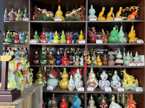 葫芦,取谐音福禄,在传统文化之中,葫芦一直都是一种吉祥福气的正向寓意代表。而抛开文化层面,葫芦在作为饮品的载具这件事上亦已流传千年,此区域所展示的各种饮用酒皆以葫芦造型作为载具,颇有种理所应当之感。 十四、逍遥山庄酒馆·酒壶酒杯区域