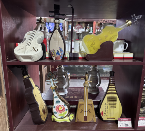 此区域所展示的各种饮用酒皆以好看为外观设计宗旨,不论是花瓶也好,摆件也罢,亦或是其他各种外观造型,其不变的始终是好看二字,酒好喝,瓶亦可欣赏,均有美好寓意。 逍遥山庄·乐器区域