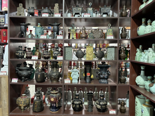 青瓷作为中华文明窑器史上浓墨重彩的一类器物,广泛运用于文化、生活等各个方面,本馆此区域则展示了部分以青瓷作为载具的各种饮用酒,将青瓷文化与酒文化相结合。 逍遥山庄酒馆·古器造型区域