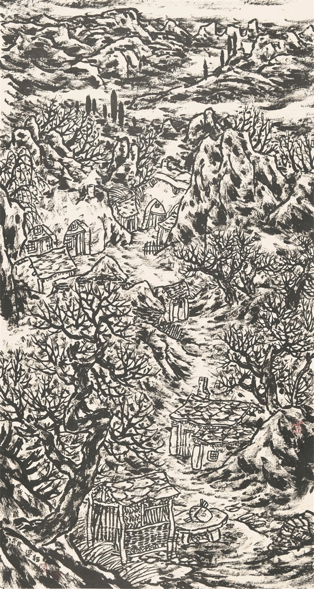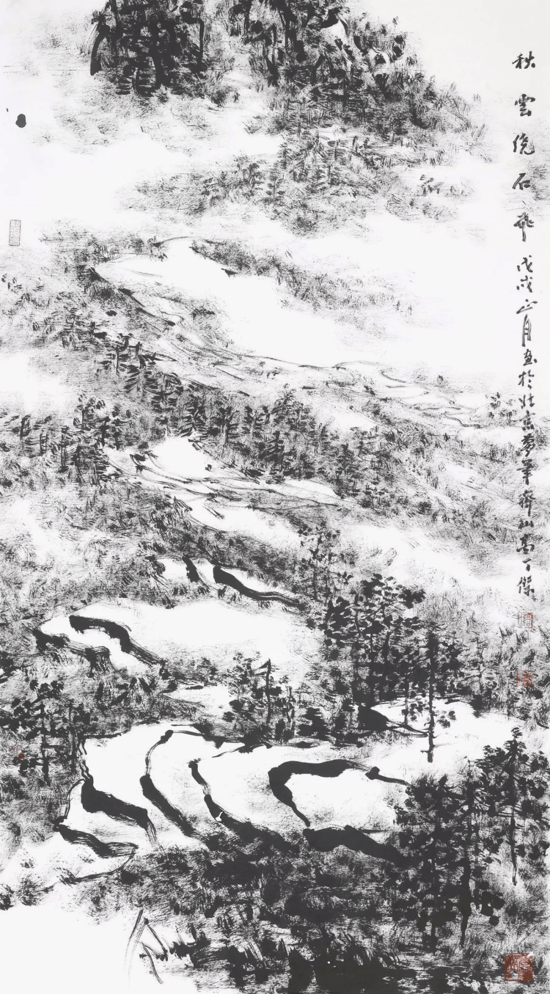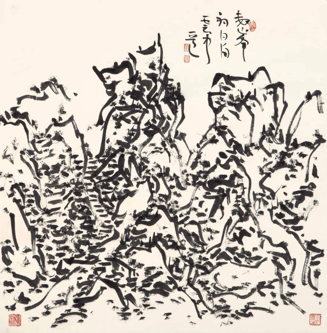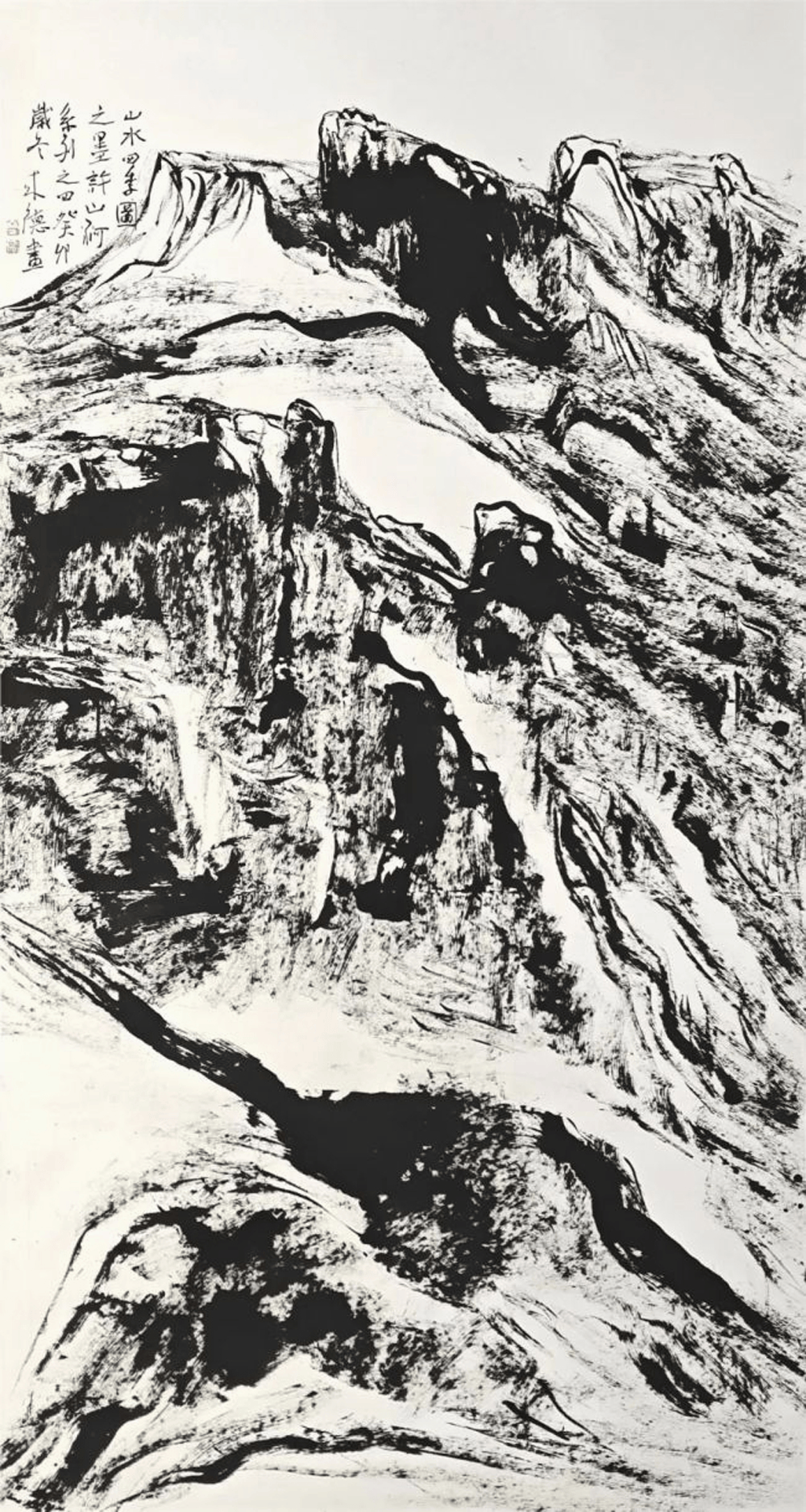 吴长江铜版作品 铜版画属于凹版画,也称蚀刻版画。 吴长江先生多年来对我在焦墨艺术上各个层面给予指引、支持与教诲。吴先生热爱青藏高原,坚持进藏写生创作,以青藏高原为艺术题材和生活的高地。 这幅作品的技术难度非常高,每一微小的空间都有笔触、方向、转折、起伏、虚实,一个角度看到安静,一个角度看到心跳,一个角度看到心地。这幅作品的完成需要直接和间接刻画时间是多少?画面完全在一个灰度里,人、动物、天地、生活、工作融化于草木层面,草木包含阳光温暖,灰调的力量渗透在纸上,在西藏到处都是坚硬,只有草木,牦牛的绒毛,人的肉体融汇出生命的温暖,聚焦到这一部分物象时也就聚焦出了诗意,聚焦出西藏独有的自然物我的感情。 从吴长江先生此幅作品中而可以得到如下结论: 灰调是艺术塑造自然非常重要的选择!灰调来自思想,来自设计、来自取舍! 笔触、刀痕在这里完全与草木、与绒毛融为一体后,美感油然而生! 焦墨如果表达刻画自然?如果笔墨细致入微分解能丝丝入扣如此,灰度剥丝抽茧如此,焦墨会给出我们一个什么样的艺术面貌? 写意,无论大写意还是小写意,都不是随意、大意、任意。 赖少其: 赖少其的山水画继承了新安画派与黄宾虹脉络,同时吸收版画技法,作品如《黄山烟雨》兼具写实与写意,被誉为“穿越古今的画坛巨匠”。70年代后他多次登临黄山,创作《黄山飞瀑》《万松图》等,以刀法入画,展现黄山雄奇与云海变幻,形成独特的“黄山美学”。 赖少其先生的这幅作品,赖先生比张仃先生小两岁(生于1915年)从时间上讲,可能早于张仃先生的焦墨,史上没有关于焦墨艺术交流的记载,从赖先生创作来看,可以明确看到水墨与焦墨在创作平面时空的交互结果和关系。 两种对立的笔法,在一种观念理念的指引下,被提纯到一定高度深度精度时,一个新的突破才会产生才会被确立。