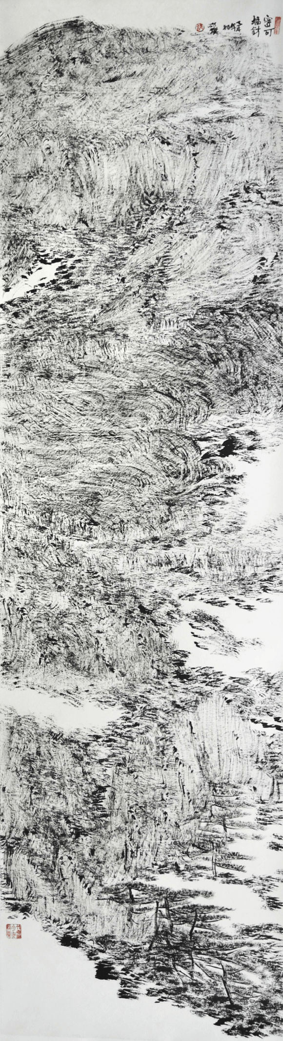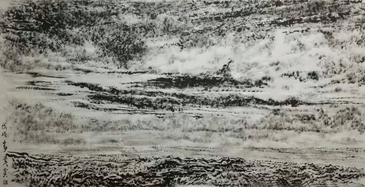 李翔和田黎明: 他们的作品与焦墨相反,其表现完全在水中展现开来,无骨有心,无形有意,湿润到极致。在高满载水的单元里,突破极限。这对焦墨创作也具有极大的启发性。