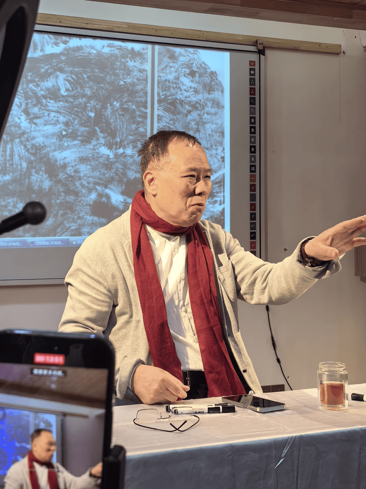 诗人、焦墨画家邵璞2025年4月在邵阳首站焦墨艺术讲座现场