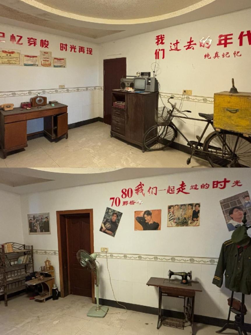 馆内收藏了70、80年代大众生活中的各种器具。柜子上的摆钟滴滴答答,电视机里的电视剧,收音机里的新闻,电话、自行车、小人书……… 丹阳名人字画馆