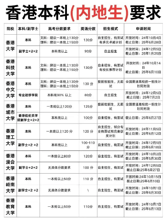 由于香港高校国际排名靠前、办学声誉好、与国际接轨程度深等因素,内地考生通过高考申请香港前几大名校的难度都非常高。 如下图所示,香港大学、香港中文大学、香港科技大学这三所“港前三”基本都要求文科一本线上130分,理科一本线上150分,英语也要求130分以上!其他几所港八大院校的高考总分和英语要求也都不低,能够被录取进来的内地考生都是各科成绩很拔尖的学生。