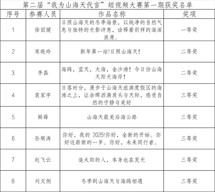 关于山海天的美,哪款最入你的眼? 日前,第二届“我为山海天代言” 短视频大赛第一期结束 获奖作品已经出炉啦! 根据活动规则并结合参赛作品相关网络数据,评选出相关奖项如下。如有异议,请于三个工作日内发送至参赛邮箱:shtwlj7171035@163.com ![]() 第二期比赛如火如荼进行中 别等了,下一个获奖的就是你!! ![]() 第二期话题 1.山海春晓·初夏潮起2.绿野仙踪·徒步探春3.十二时辰的山海日记