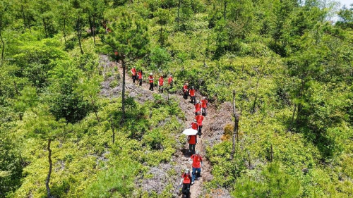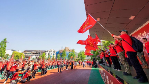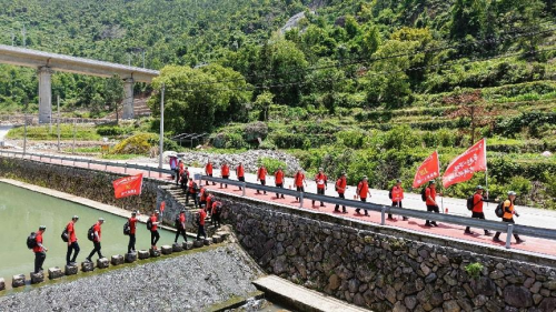 追寻先辈足迹,感悟初心使命。上午9点10分,由100支团队、2000余人组成的队伍整齐“一字”排列,高举旗帜,正式踏上征程,本次活动全称约12公里,途径高浦渔村、永嘉烈士陵园、渔田村、太平岭、古庙口村等14处地点,他们用脚步丈量信仰的高度,以行动诠释初心的力量。 一路高歌,奋勇前行。行军至渔田村时,距出发时间已过1小时,当日室外最高气温已突破30℃,即使烈日当空,但队员们丝毫没有放弃,他们精神饱满,相互激励,或大喊口号振奋士气,或高唱红歌汲取力量。《东方红》《打靶归来》等红歌在绿水青山间回荡。 路程行进过半,首支队伍率先抵达位于古庙口村的物资补给站。这个由当地村民自发组织的志愿队伍早已准备就绪。“我们早上三点就开始准备了,我也是一名党员,也是为他们尽一份自己的力量。”来自周边村庄的志愿者吴彩平说道。此外,补给站还举行了欢送仪式——由上路垟村的村民自发组成的腰鼓队,正打起鼓、跳起舞,为即将继续征程的队员们壮行。这动人的一幕,让我仿佛看到了当年老区群众欢送红军的场景,他们也在用最质朴的方式传承着这片红色土地的精神血脉。