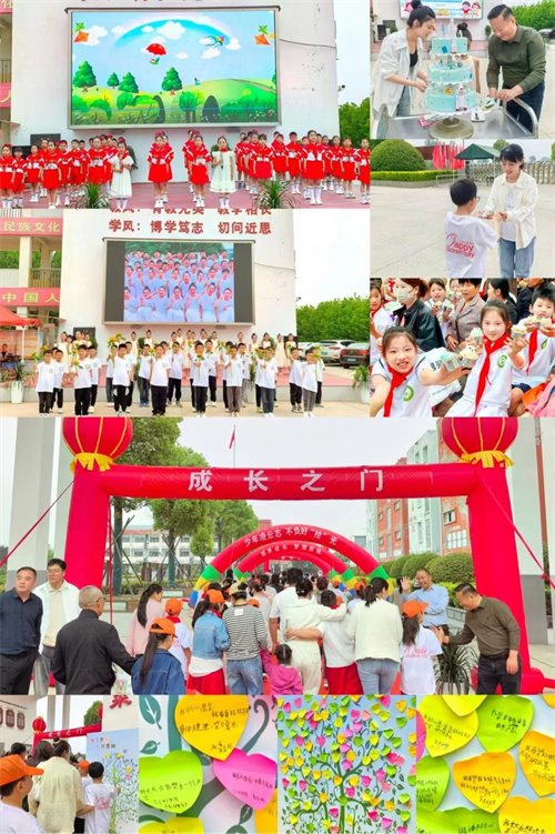 伴随着欢快的音乐,三(5)班同学带来《勇气大爆发》手势舞,活力四射的表演点燃全场。生日庆典环节,孩子们在摇曳的烛光中许下心愿,汪校长、赵羽涵同学与家长、刁老师共同切开生日蛋糕,并将象征甜蜜与祝福的小蛋糕分发给每位学生。三(1)班压轴表演《花开十岁礼》,以诗意的舞蹈演绎成长的蜕变。活动尾声,孩子们将写满心愿的卡片贴在“成长树”上,手挽父母走过“成长门”,在掌声与欢呼中迈向人生新征程。