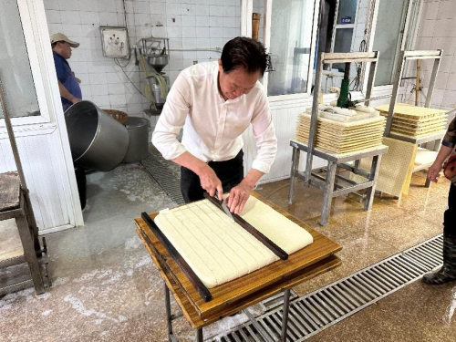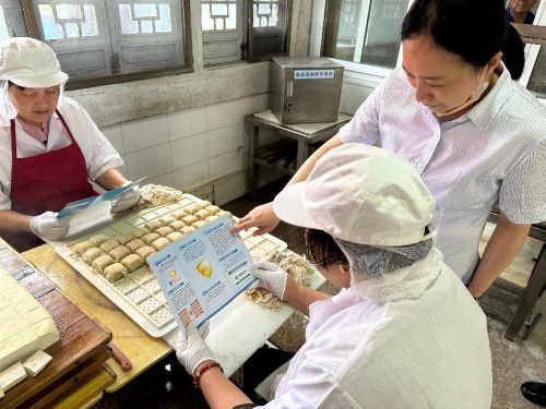 活动现场,民泰银行舟山分行“红百合志愿服务队”邀请了岱山香干制作技艺传承人,现场展示香干的传统制作流程。从精选上乘大豆开始,到细腻磨浆、温火煮浆、精准点卤、匠心压制,直至最后的秘制卤制,围观的群众不仅被这一传统手工艺的魅力深深吸引,更对这份承载着百年历史与文化的瑰宝有了更深的理解和敬佩。而在香干制作的温馨氛围中,该行红百合志愿者不失时机地穿插讲解存款保险的相关知识,他们用接地气的舟山方言,将复杂的金融概念转化为易于接受的实例,如将存款保险比作存款的“安全锁”,无论银行遇到何种情况,储户的存款都能得到保障,就像香干经过层层工序后,依然能保持独特的风味和品质一样。这样的讲解方式,让金融知识变得生动有趣,深入人心。