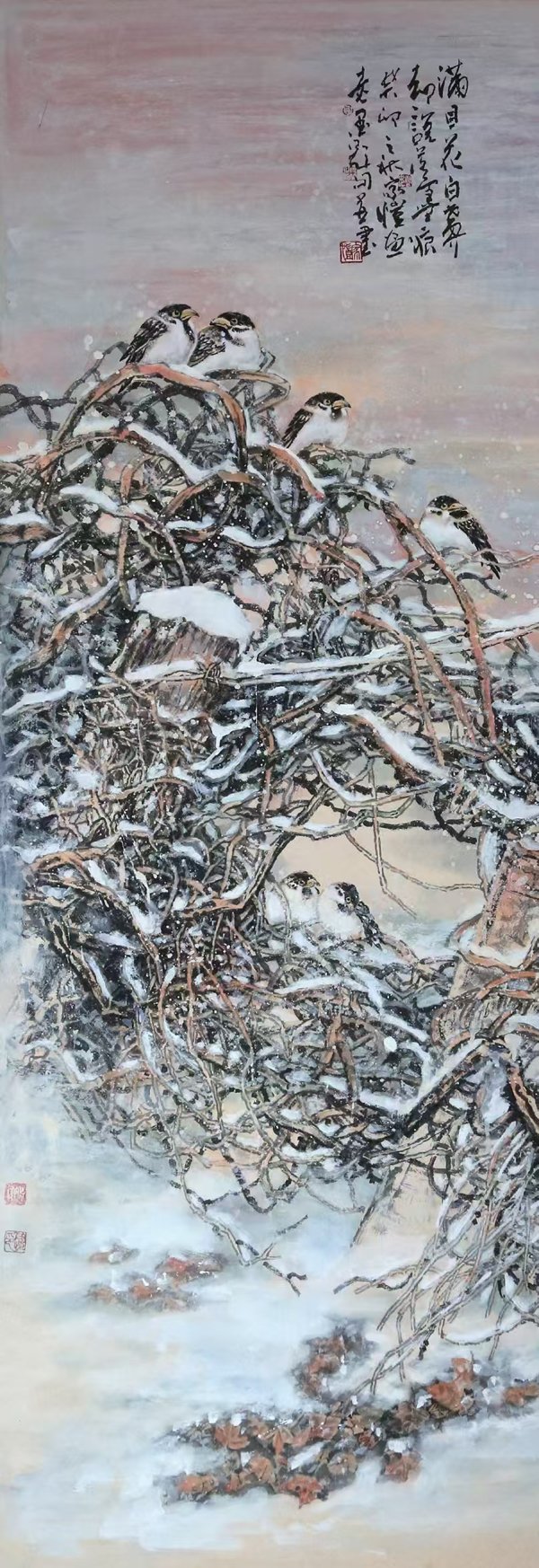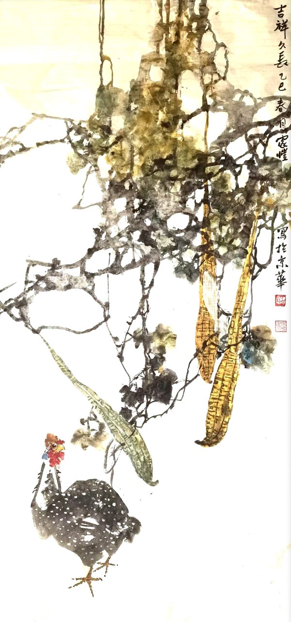 ——宋涤(建公) 原中央工艺美术学院教授、清华大学 ![]() 于笔墨间寻生机 ——评姚家恺老师的中国写意花鸟画 在当代中国写意花鸟画坛,姚家恺老师的作品宛如一股清新之风,既蕴含着传统的深厚底蕴,又彰显出独特的个人风格。 姚家恺老师的画作,在笔墨运用上堪称精妙。写意花鸟画的核心在于笔墨,而他深谙此道。其用笔灵动且富有变化,中锋、侧锋、逆锋交替使用,线条或刚劲挺拔,或婉转流畅,似有生命一般在宣纸上跳跃。以画中鸡的勾勒为例,用中锋线条精准地塑造出鸡的轮廓,体现出其挺拔之态;描绘鸡爪时,逆锋用笔又赋予了鸡爪以苍劲之感,仿佛能感受到鸡爪抓地的力量。在用墨上,他亦能巧妙掌控浓淡干湿。画中葡萄藤蔓,以浓墨表现主干的厚重沉稳,淡墨晕染则呈现出藤蔓的轻盈飘逸,墨色在他的笔下自然交融,层次丰富,尽显“墨分五色”之妙。这种笔墨的运用,不仅是对物象形态的塑造,更是画家情感与精神的寄托,每一笔都饱含着他对绘画对象的深刻理解与独特感悟。 从构图上看,姚家恺老师的作品颇具匠心。画面疏密有致,虚实相生。在这幅画中,葡萄枝叶繁茂,占据了画面的主要部分,形成了“密”的视觉效果;而三只鸡在画面下方,留出了大量空白,此为“疏”。疏密之间,形成了强烈的对比,却又和谐统一。同时,枝叶的实与背景的虚相互映衬,使得画面富有空间感和层次感,营造出一种独特的意境。这种构图方式,既遵循了中国传统绘画的美学原则,又融入了自己的创新思考,展现出别具一格的艺术魅力。 ![]() 在主题表达方面,姚家恺老师的写意花鸟画充满了生活情趣与生机活力。鸡与葡萄的组合,看似寻常,却在他的笔下被赋予了新的内涵。鸡的形态各异,或昂首张望,或低头觅食,生动活泼,展现出生命的灵动之美;葡萄果实饱满,藤蔓缠绕,寓意着丰收与富足。他通过对这些常见物象的描绘,传递出对生活的热爱与赞美之情,让观者在欣赏画作的同时,也能感受到那份源自生活的美好与温暖。 ![]() 当然,姚家恺老师的作品在不断成熟与精进的过程中,也还有进一步探索的空间。例如,在色彩的运用上,或许可以尝试在保持墨韵为主的基础上,适当融入更多大胆而新颖的色彩元素,为画面增添更为多元的视觉感受;在题材的拓展方面,也可以挖掘更多具有时代特色和个人独特视角的内容,使作品在反映生活的同时,更具时代的前瞻性与艺术的引领性。 ![]() 总体而言,姚家恺老师的中国写意花鸟画在笔墨、构图、主题表达等方面均展现出较高的艺术水准。他在传承传统写意花鸟画精髓的基础上,不断探索创新,逐渐形成了自己独特的艺术风貌。期待他在未来的艺术创作中,能够继续深耕,创作出更多精彩且富有深度的作品,为中国写意花鸟画的发展注入新的活力。 ![]() ![]() ![]() ![]() ![]() ![]() ![]() ![]()