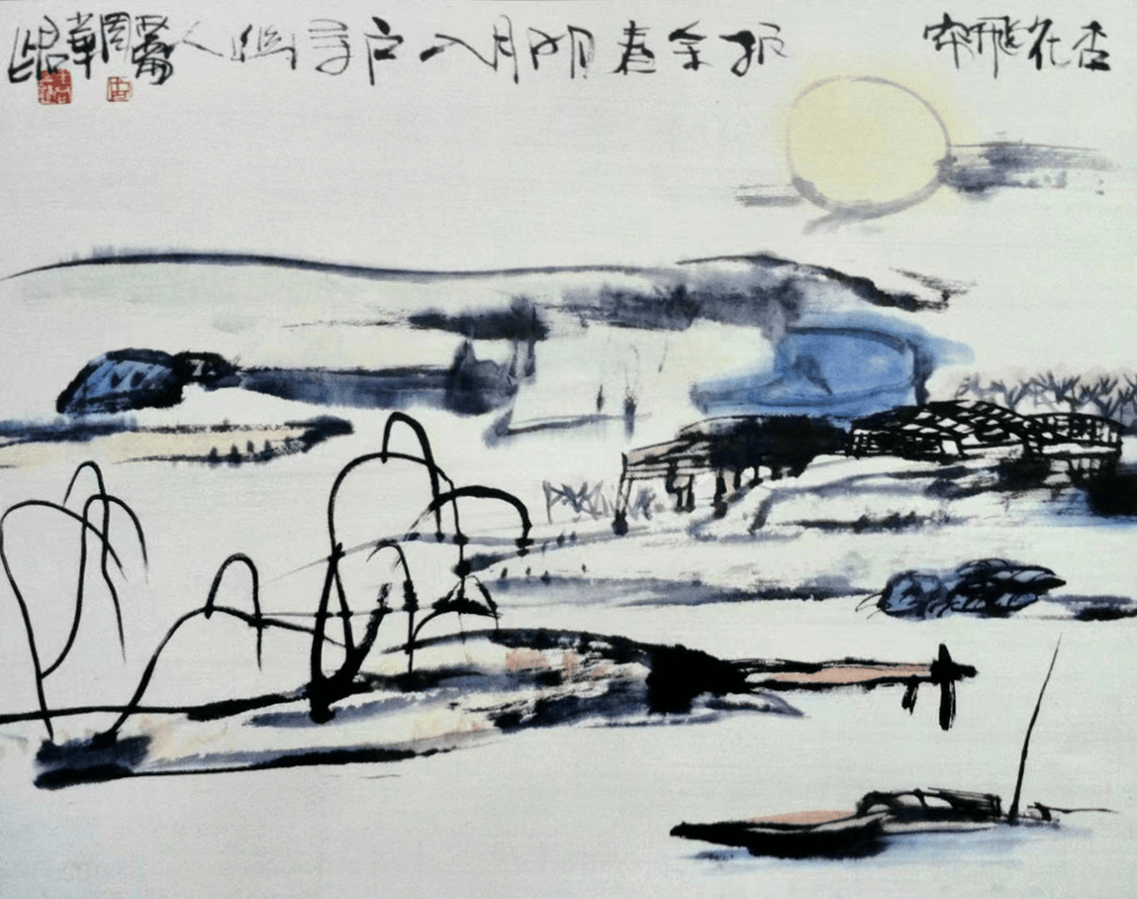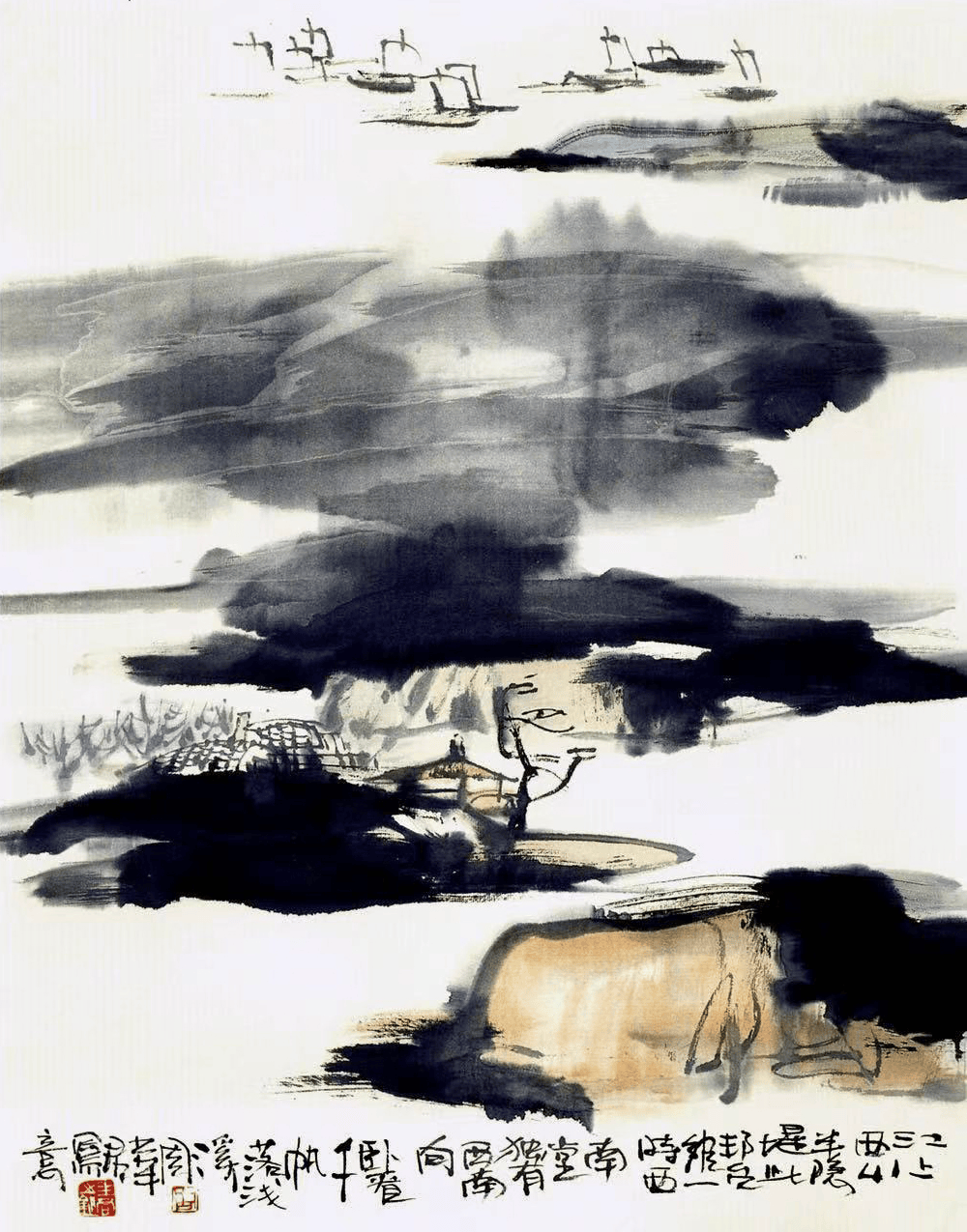 传统笔法与西洋技巧交替使用,无迹可寻,“旧貌换新颜”,变异出一种深远的意境和动人的笔墨情调,形成新“法”,充分体现出独创性与文化性。特别是那用笔的挥洒恣肆使得山水精神变得意境阔大而深邃幽远,格调宁静而志远,成为了他独特的画作语汇。 南朝王微《叙画》中有一句:“望秋云,神飞扬;临春风,思浩荡”。这里是说以满腔激情去拥抱自然,用炙热的心渗透于天地自然之中的艺术家对待生活,造化的真诚。华君就是这样“外师造化,中得心源”的艺术家。他把写生看做是自己创作的源,对大自然,总是以童稚般的真情天趣去体察朝晖夕阳,烟笼雾锁,潮涨月明,云淡风情的变幻。在数十年的朝山夕水,幽林野滩的艰苦认识中,感受到了自然的博大、凝重和肃穆,寻求自然时空与心灵意象的契合。