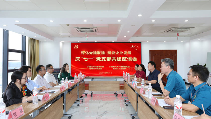 为深化党支部间协作交流,推动党建引领企业高质量发展,2025年7月1日,广西天缘绿生物科技有限公司党支部与广西软实力文化科技集团有限公司党支部携手开展“深化党建联建 赋能企业发展——庆‘七一’党支部共建座谈会”,会议在天缘绿集团总部召开。